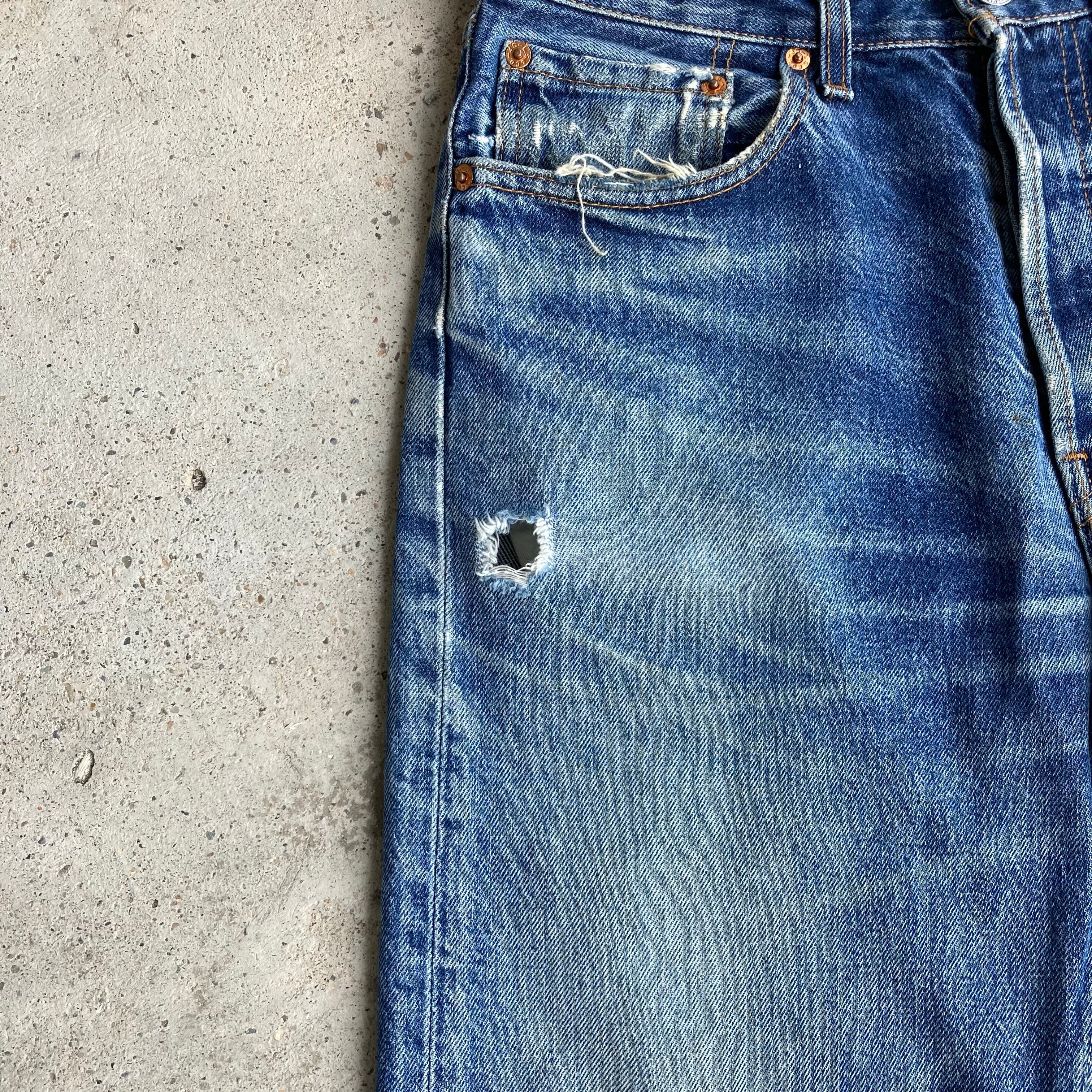破れや穴あきのダメージはございますが、非常に雰囲気の良い一本となります。シルエットも細すぎず絶妙なバランスです。