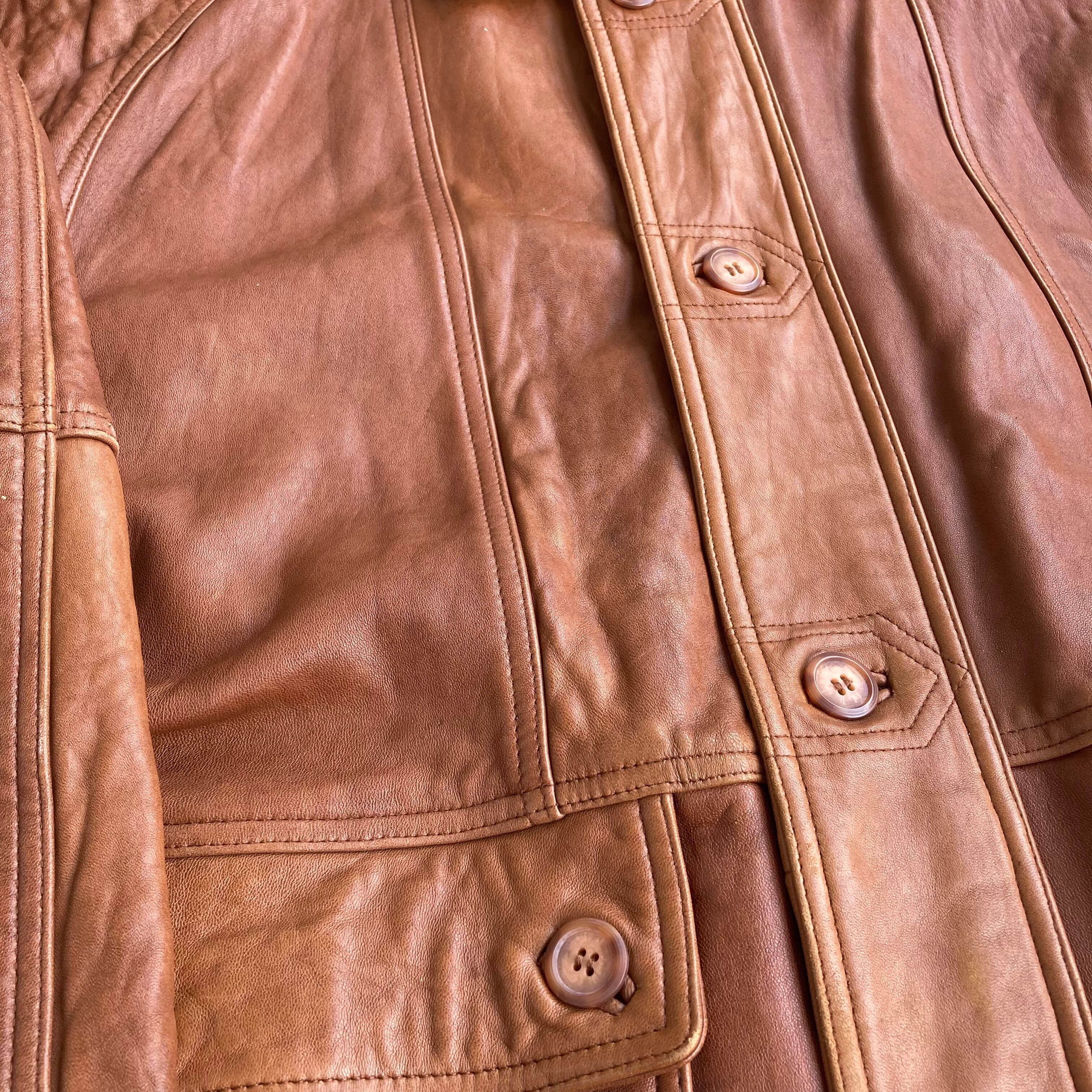 キャメルカラーの レザージャケット カーコート になります。 着丈の長さ的に レザーコート ハーフコート 感覚で着て頂けるかと思います。