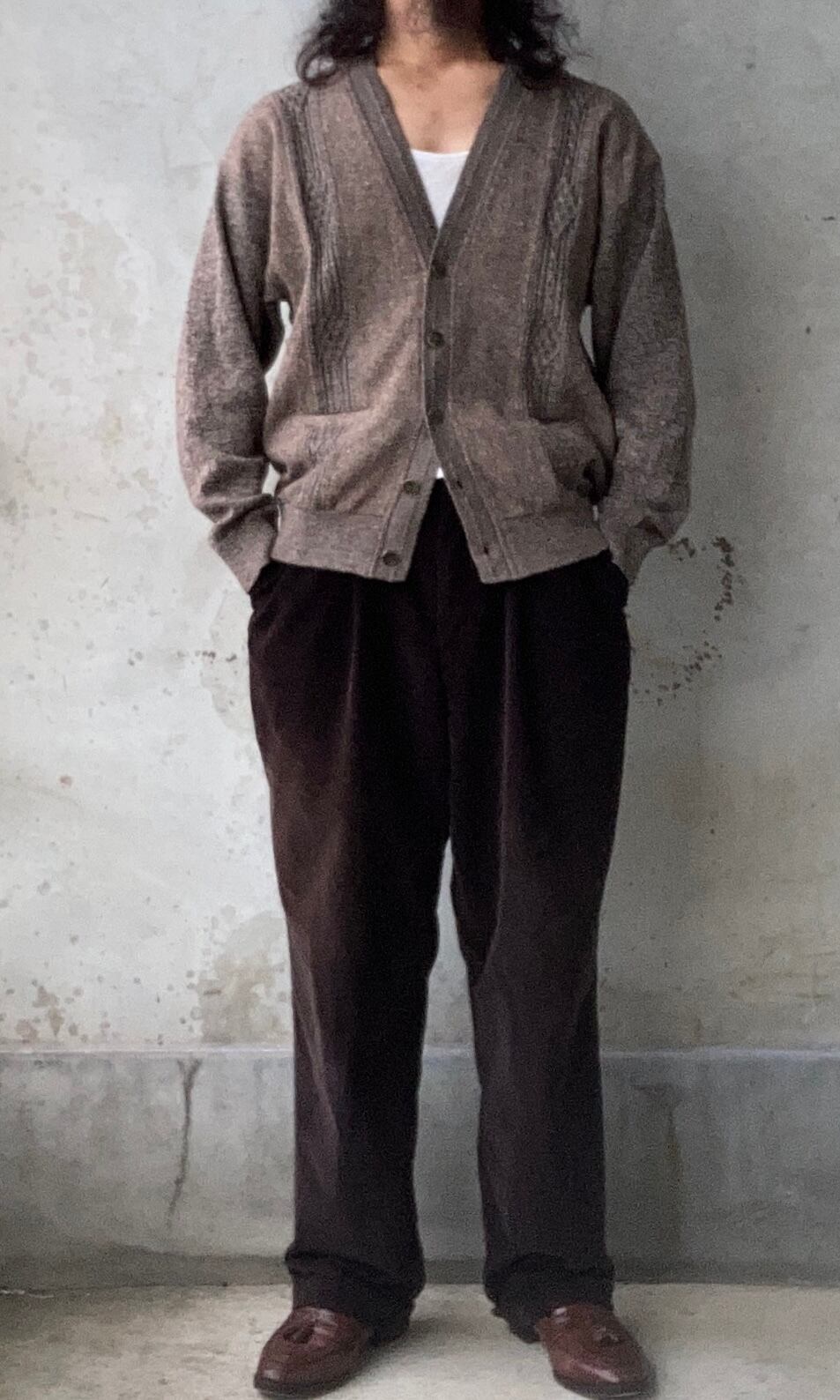 ブラウンベージュカラーのアクリルカーディガンになります。ボディの一部にケーブルニット、カラーネップが織り交ぜております。