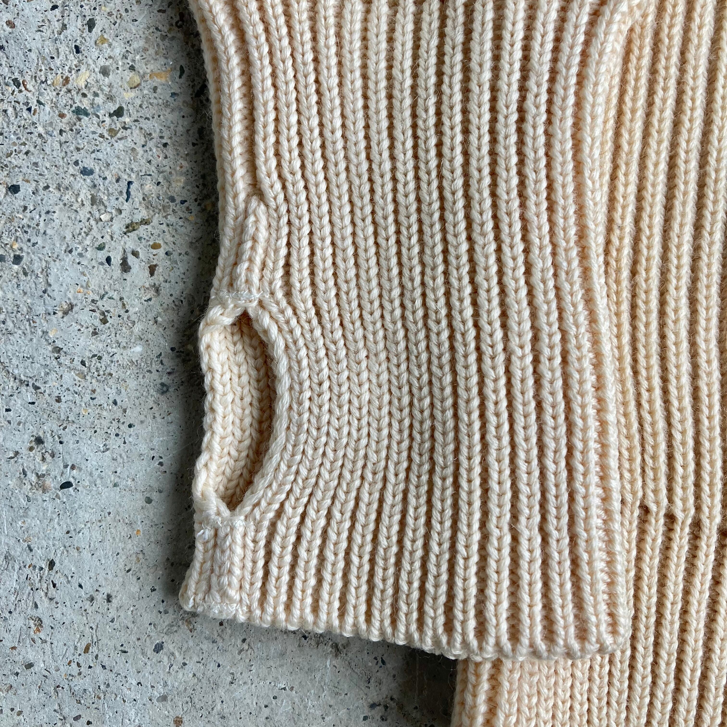 忙しい船員達のフィッシャーマンセーターのデザインにインスピレーションを受け、前後を気にせず気軽に着られるように設計。 フルファッション製法を採用しており、負荷が掛かる箇所にカンヌキ留めを施しており徹底的に耐久性にこだわった仕上がりに。