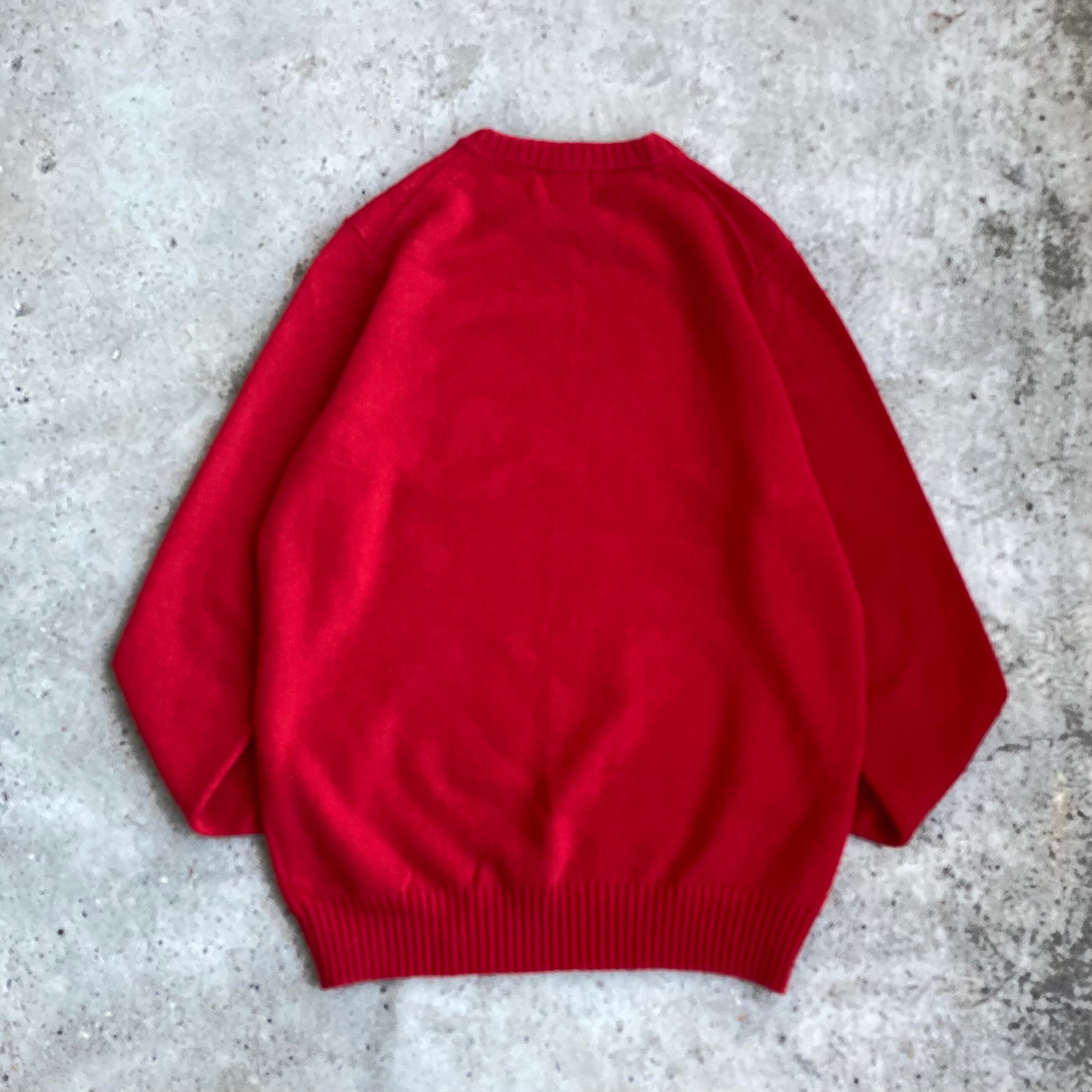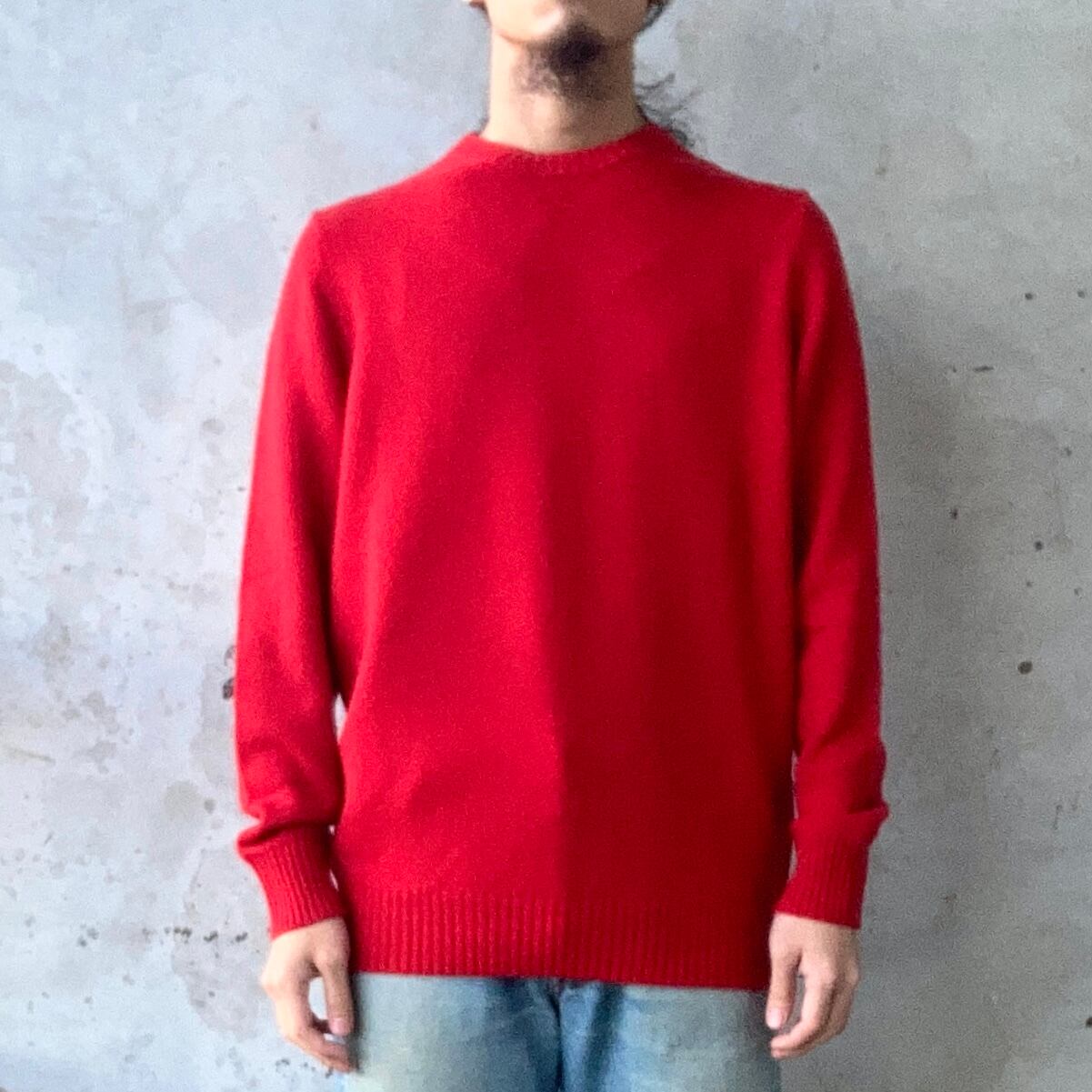 鮮やかなレッドカラーのクルーネックセーターになります。冬場はダークトーンのスタイルに差し色として映えるかと思います。