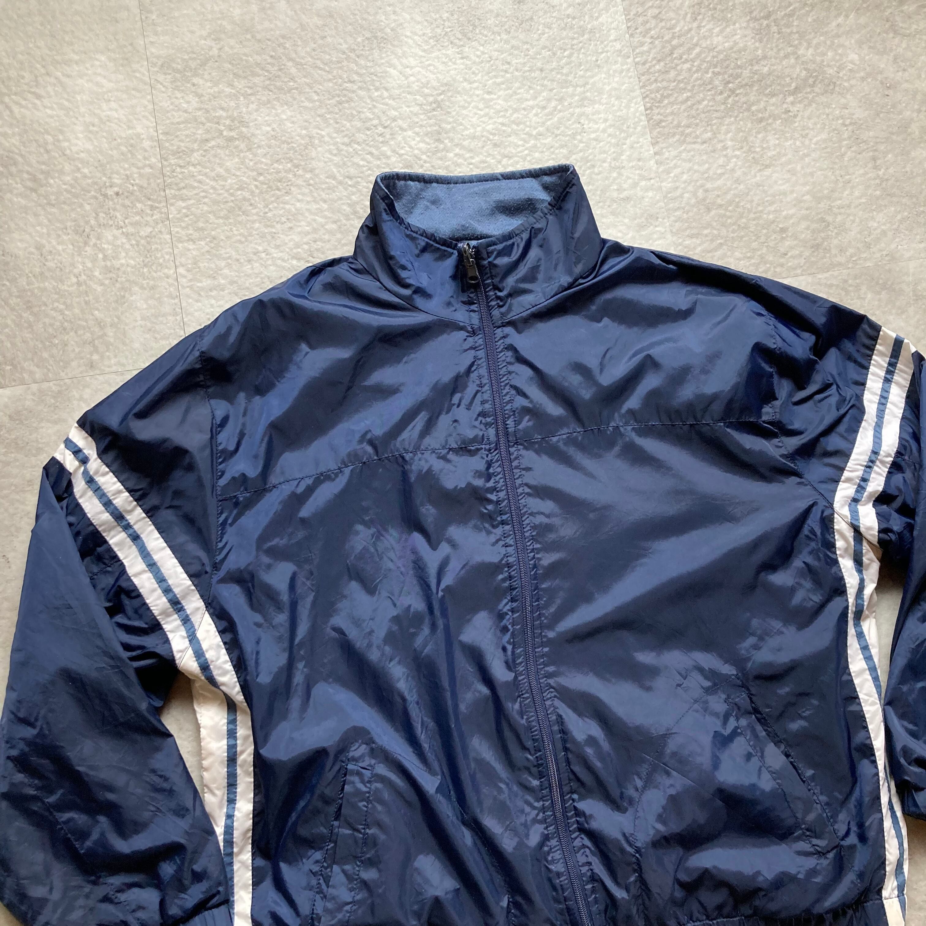 ネイビーのボディにホワイトのラインが爽やかな1着です。ジップを調整してハイネックや襟の形のようにシルエットを変えられます。