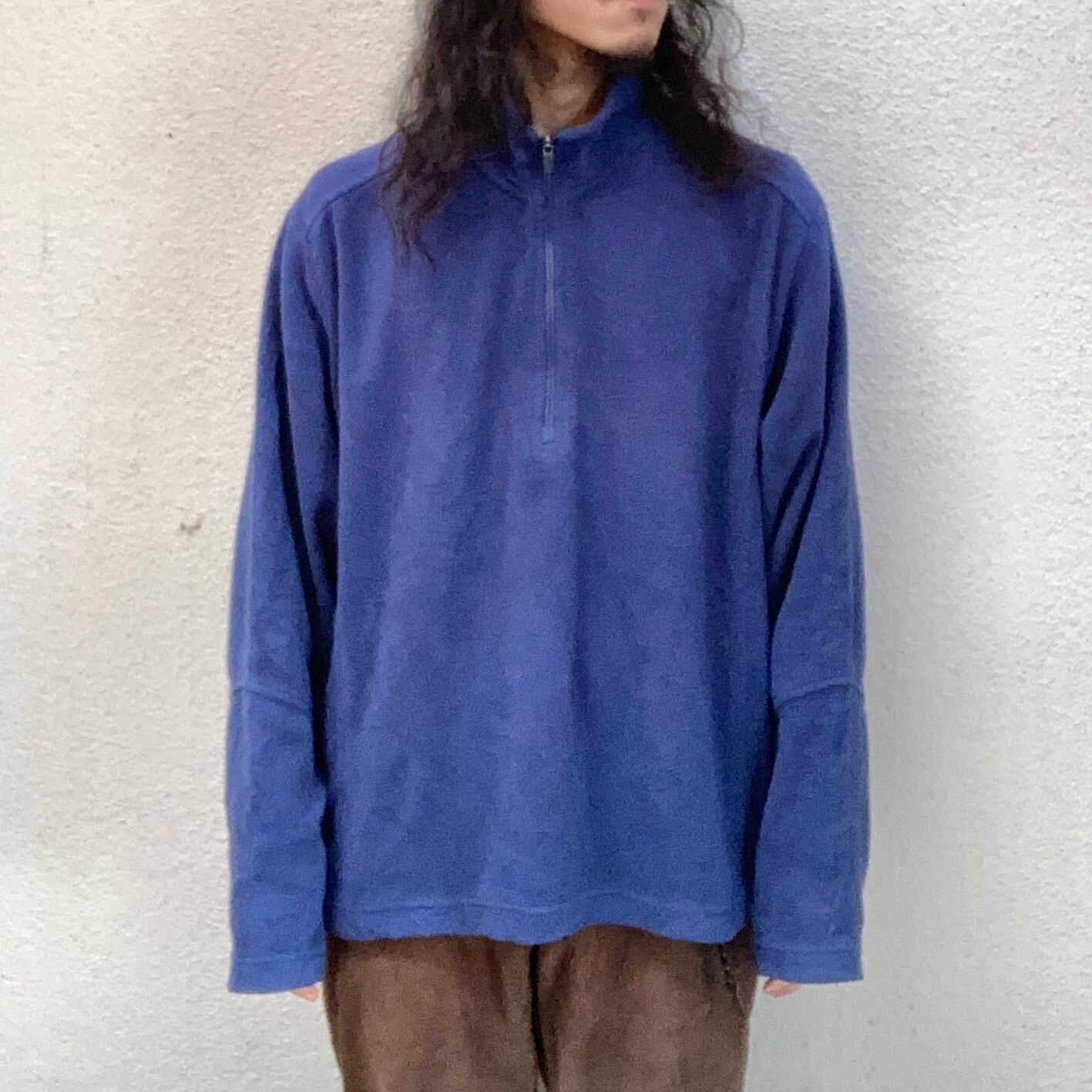 XLの オーバーサイズ ビッグサイズ のハーフジップフリースになります。広い身幅で下に広がるようなシルエットですので、緩くラフに着用して頂けるかと思います。