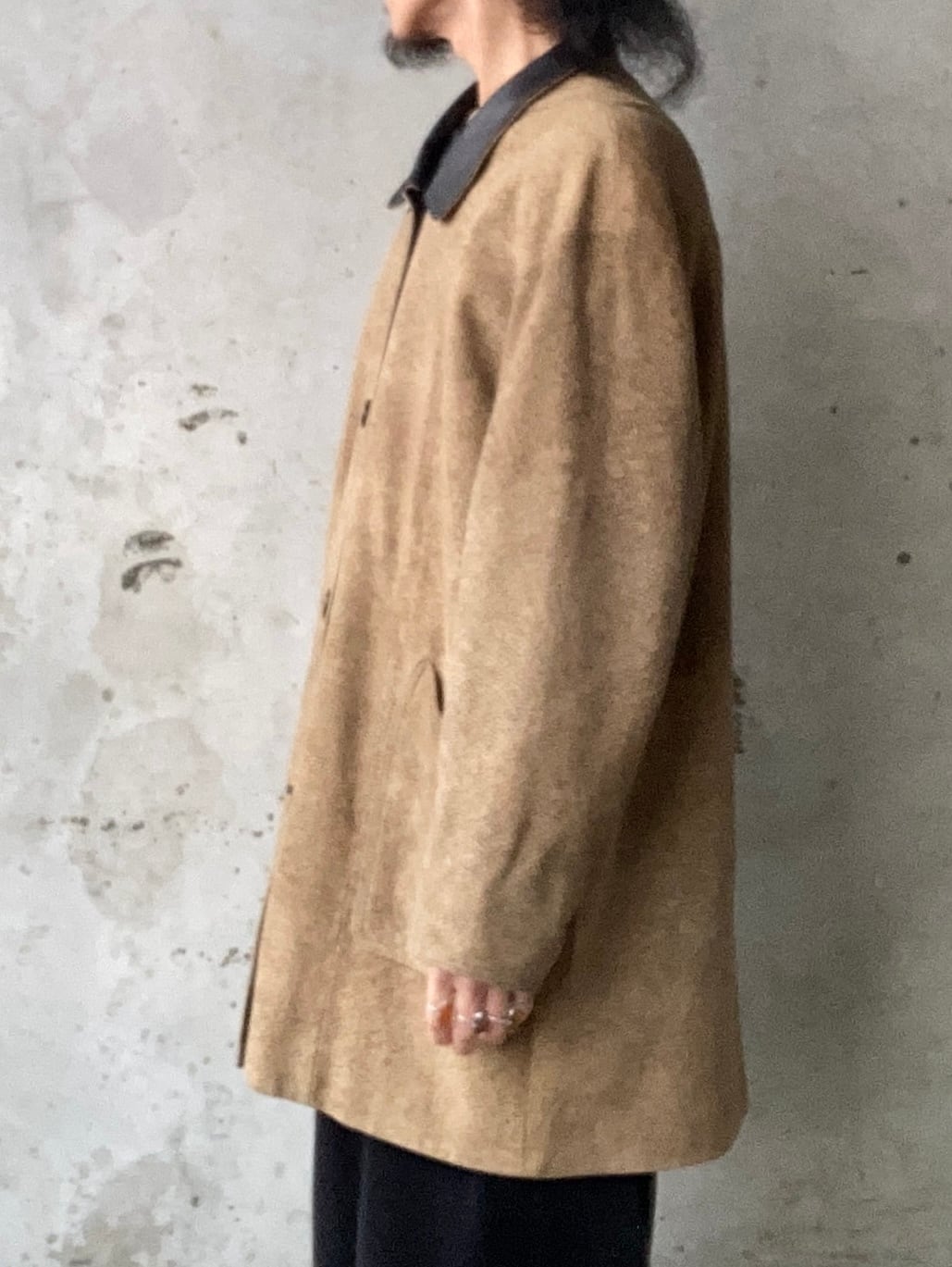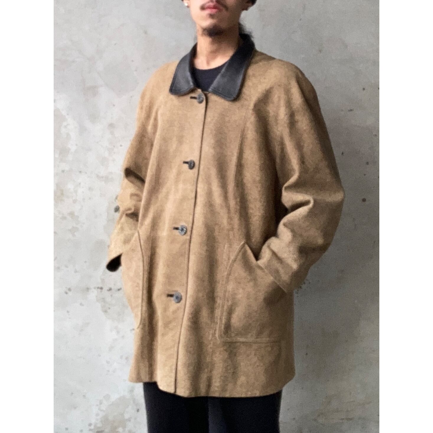襟がレザーに切り替えデザインされたラムレザーコートになります。