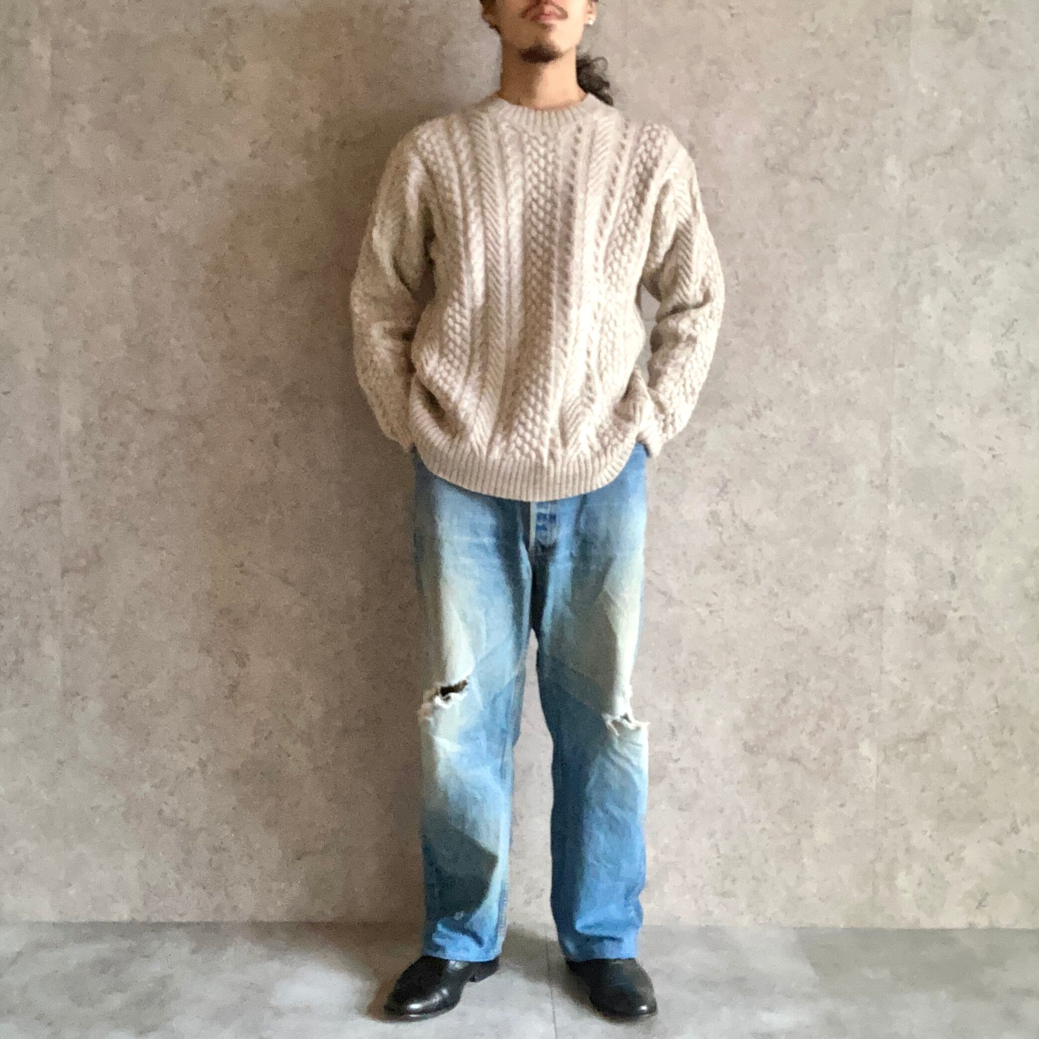 アイボリーカラーと、フィッシャーマンセーター特有のざっくりとした編み目が雰囲気ある1着です。程よく オーバーサイズ ですので、緩く着用して頂けるかと思います。