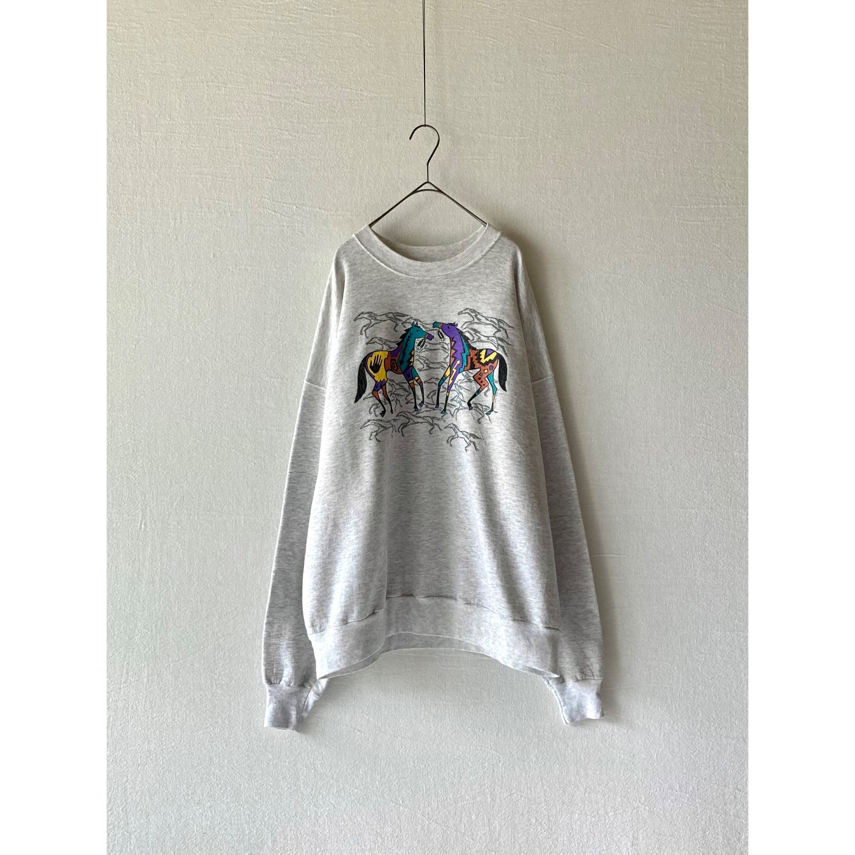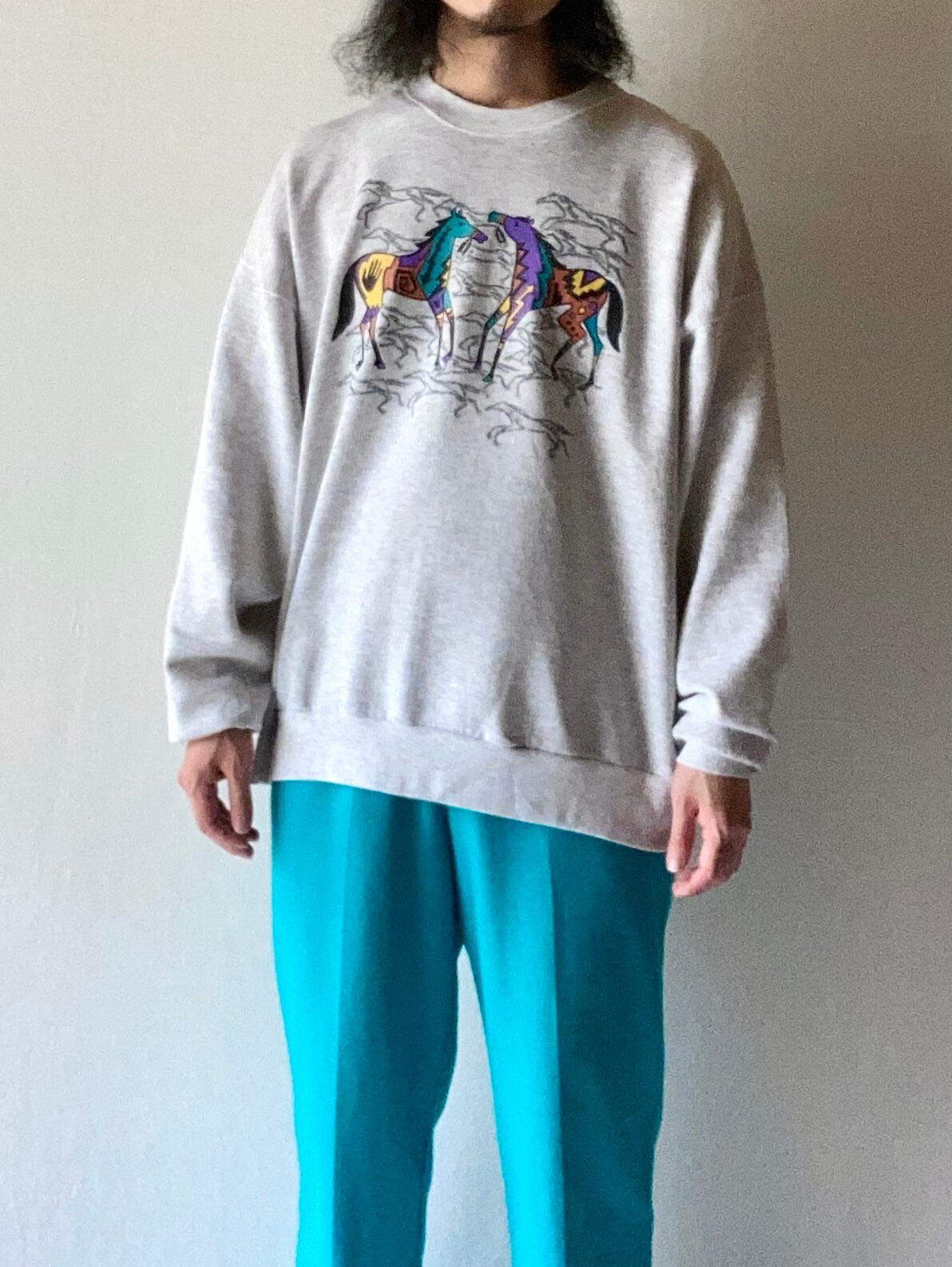 90s USA製 Hanes の print sweatになります。鮮やかな2頭の馬が描かれた可愛らしい1着です。sizeXLの ゆったりとしたサイジングですので、緩くラフなスタイルがお好きな方におすすめです。
