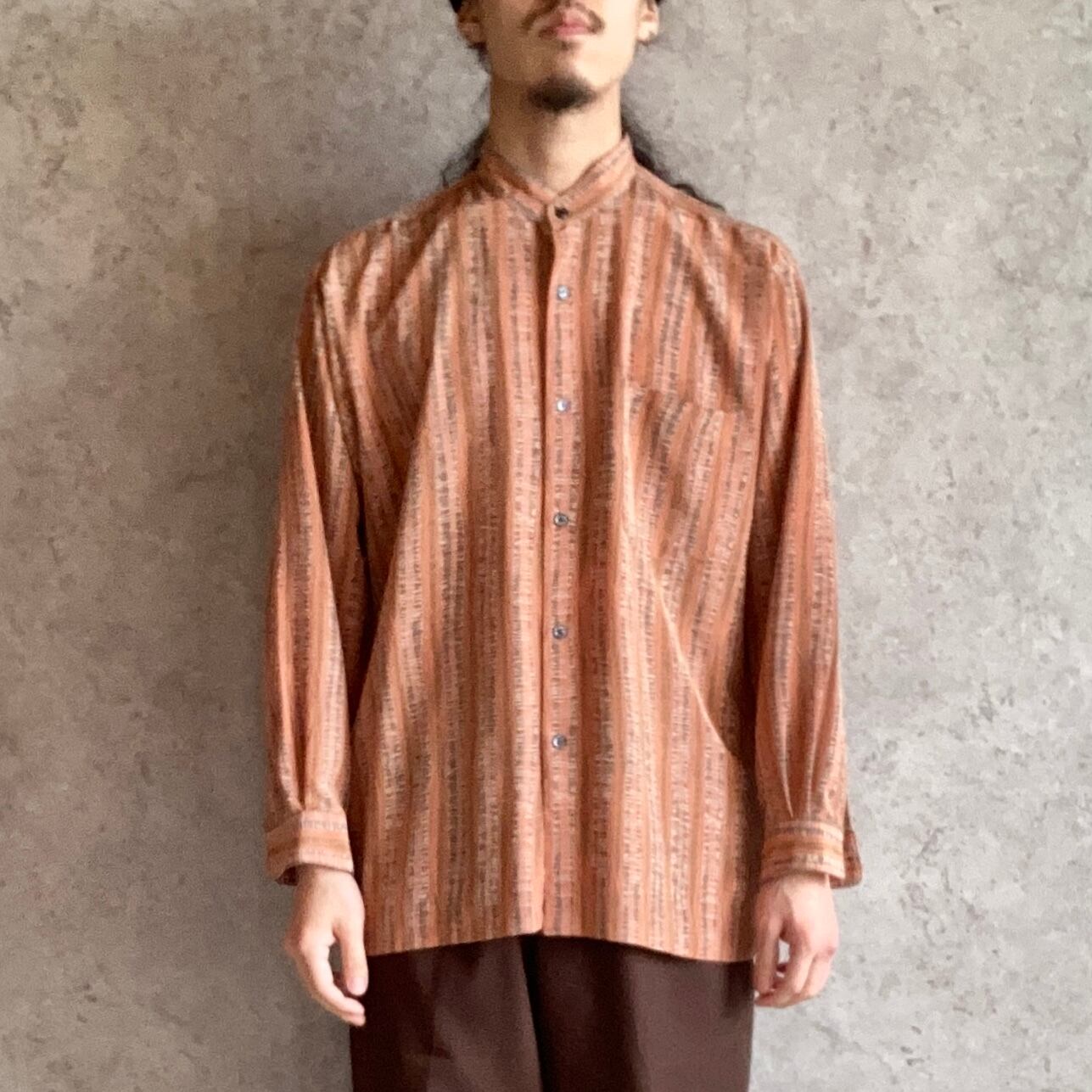 オレンジカラーのバンドカラーストライプシャツになります。タグの表記が消えているため素材など詳細は不明ですが、サラサラと気持ち良い肌触りの良い着用感となっております。