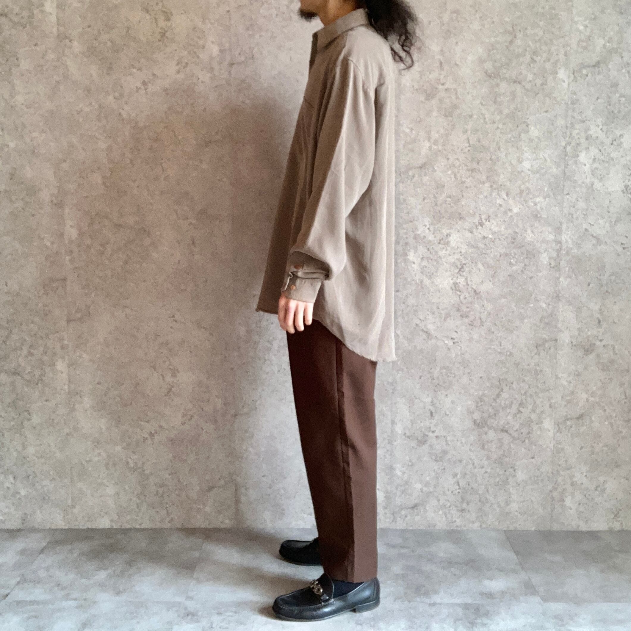 落ち着いた印象のモカブラウンカラーの1着になります。サラサラとした肌触りと光沢感があります。生地のモダールはシルクのような肌触りと光沢が特徴的で、水洗いが出来る、吸湿性に優れている、放湿性に優れているなどの利点があります。