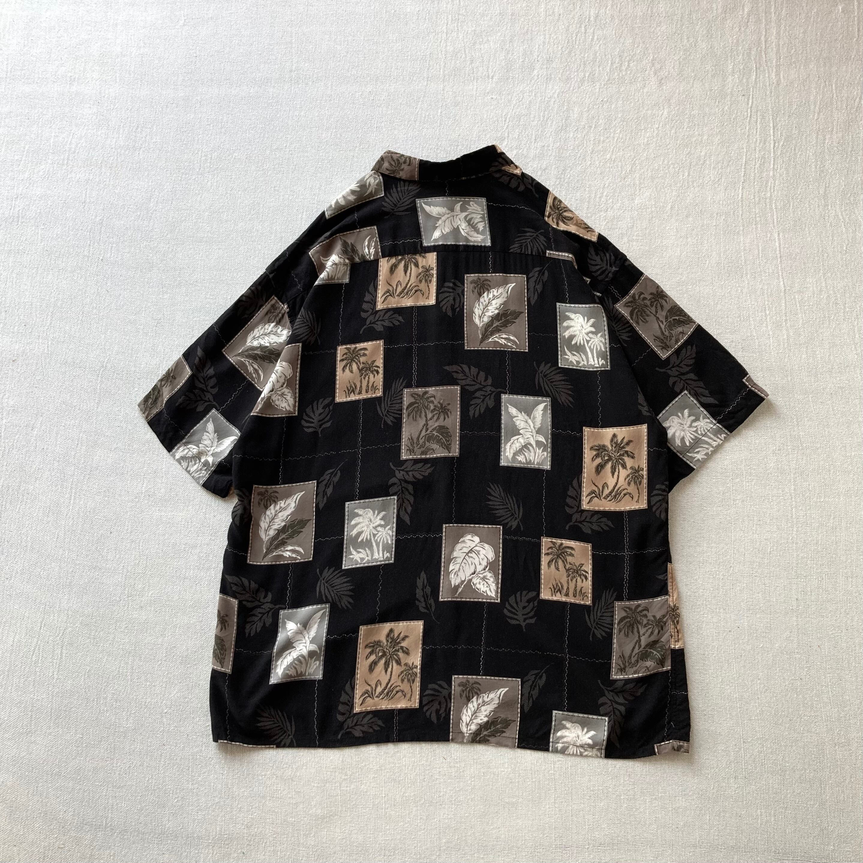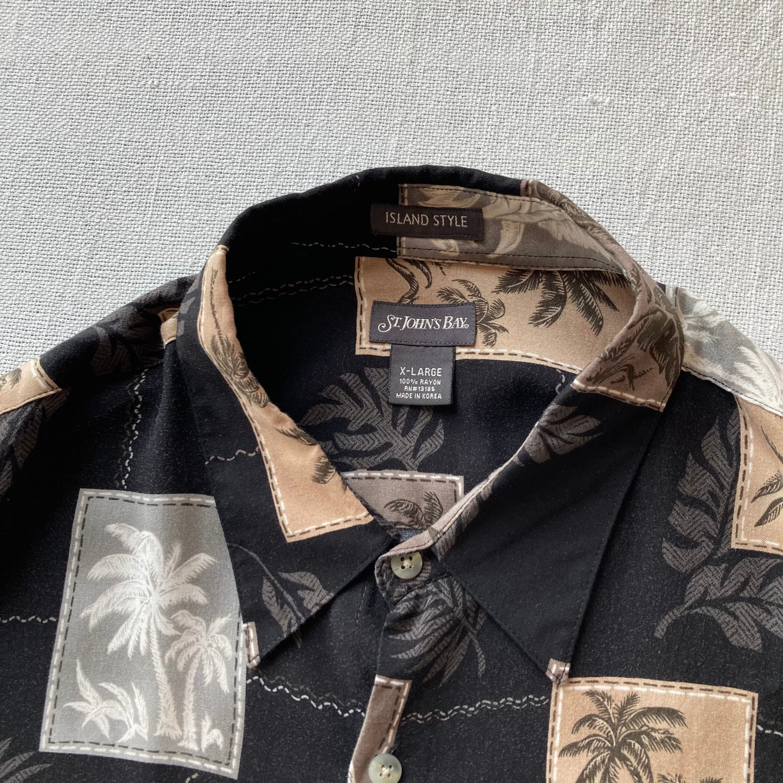 ST.JOHN'S BAY のpattern rayon shirtになります。black rayon地に、リゾート感のある夏らしい総柄がデザインされた1着です。滑らかでテロっとしたrayonの肌触りが非常に気持ち良いと思います。