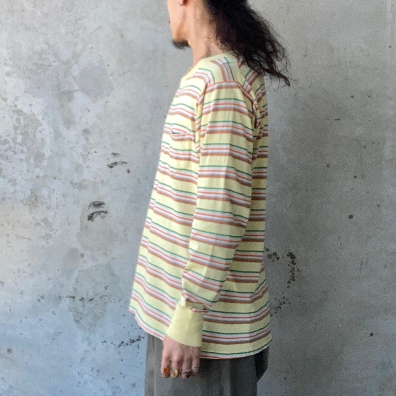 50s PENNEY'S TOWNCRAFT のマルチボーダーロンTになります。ライトイエローのボディにグリーン・オレンジ系のボーダーが可愛らしい1着です。生地も薄手ですので、1枚でもインナーとしても非常におすすめです。胸元にポケットも付いており、ちょっとした機能性もあります。