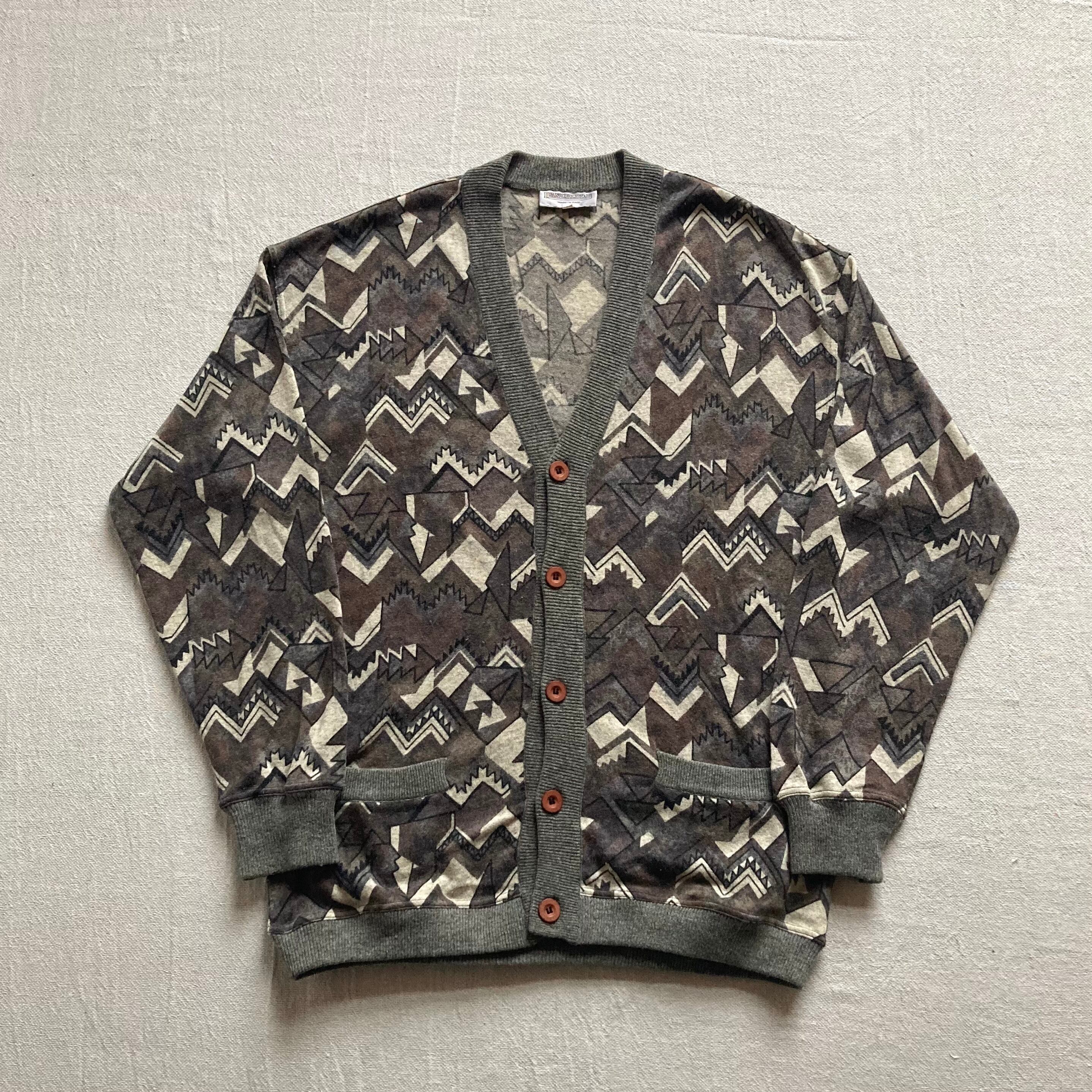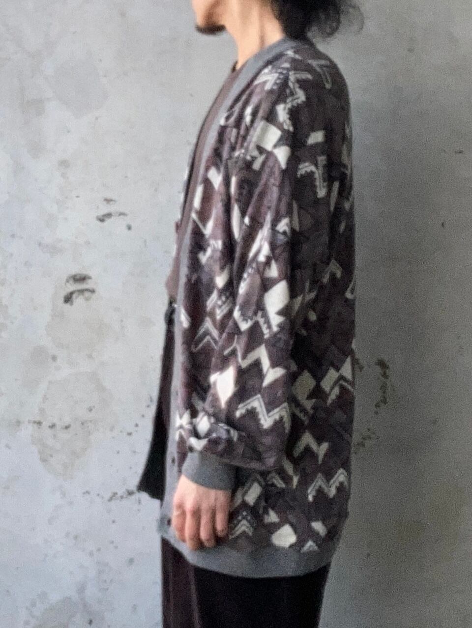 Italia製の総柄カーディガンになります。パープルグレー系のジオメトリック柄が個性的で素敵な1着です。オーバーサイズ のシルエットでラフに着て頂けそうです。比較的薄手の生地感になりますので、通年で着用して頂けるかと思います。