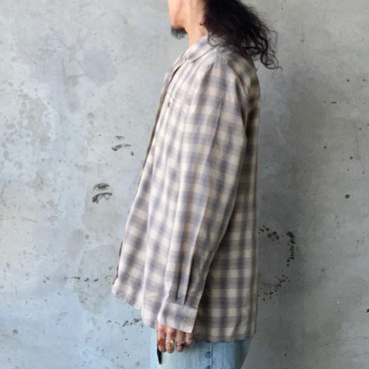 雰囲気良い色味のオンブレチェックオープンカラーシャツになります。レーヨン混合生地ですので、薄手でサラサラとした気持ち良い着心地の1着です。春時期に非常におすすめです。