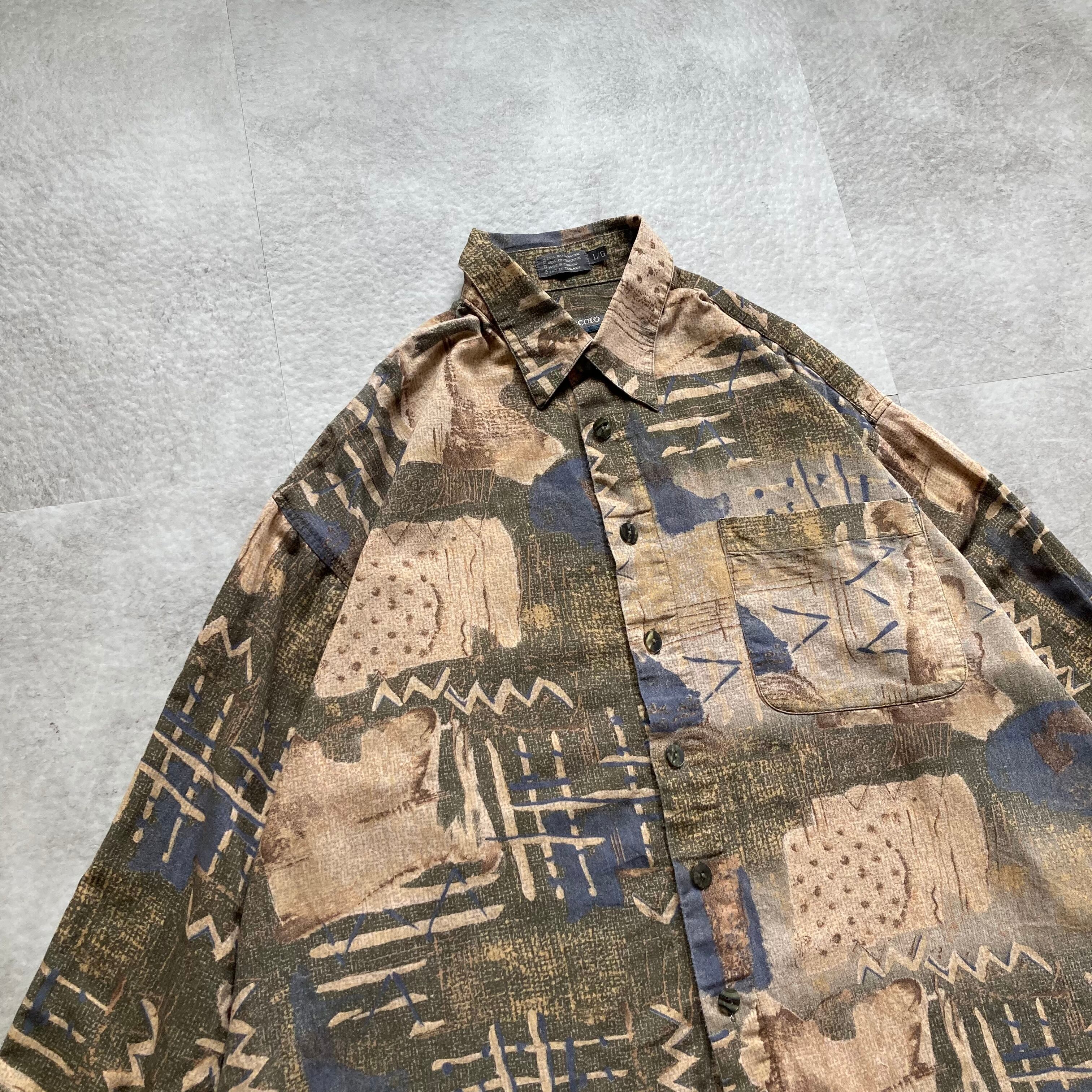 artisticな雰囲気の総柄レーヨンシャツになります。個性的なデザインですが、ブラウンベースのカラーリングですので派手過ぎず落ち着いた印象も受けます。加えてレーヨン混合の薄手生地ですので、ゆるっとラフに着て頂けるかと思います。