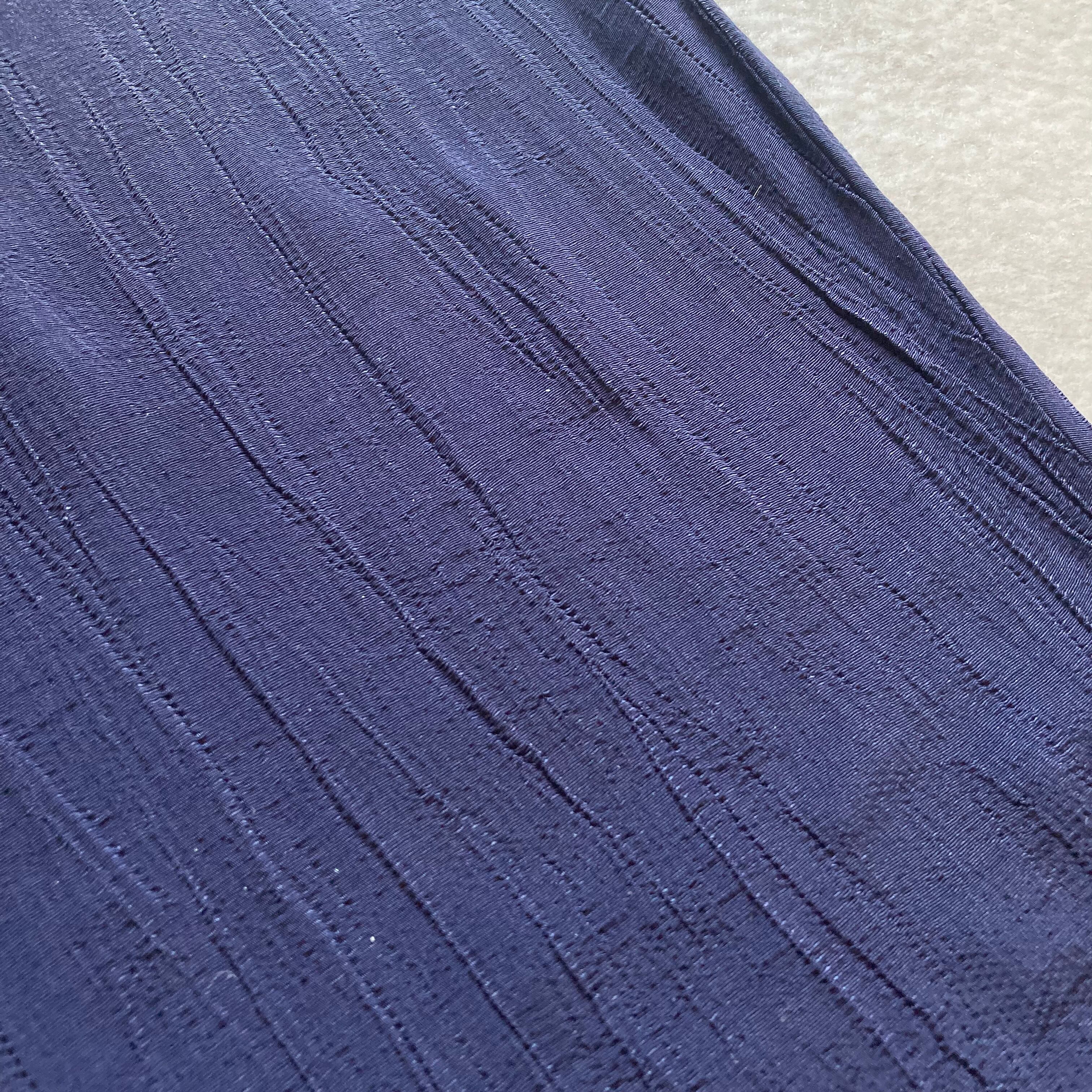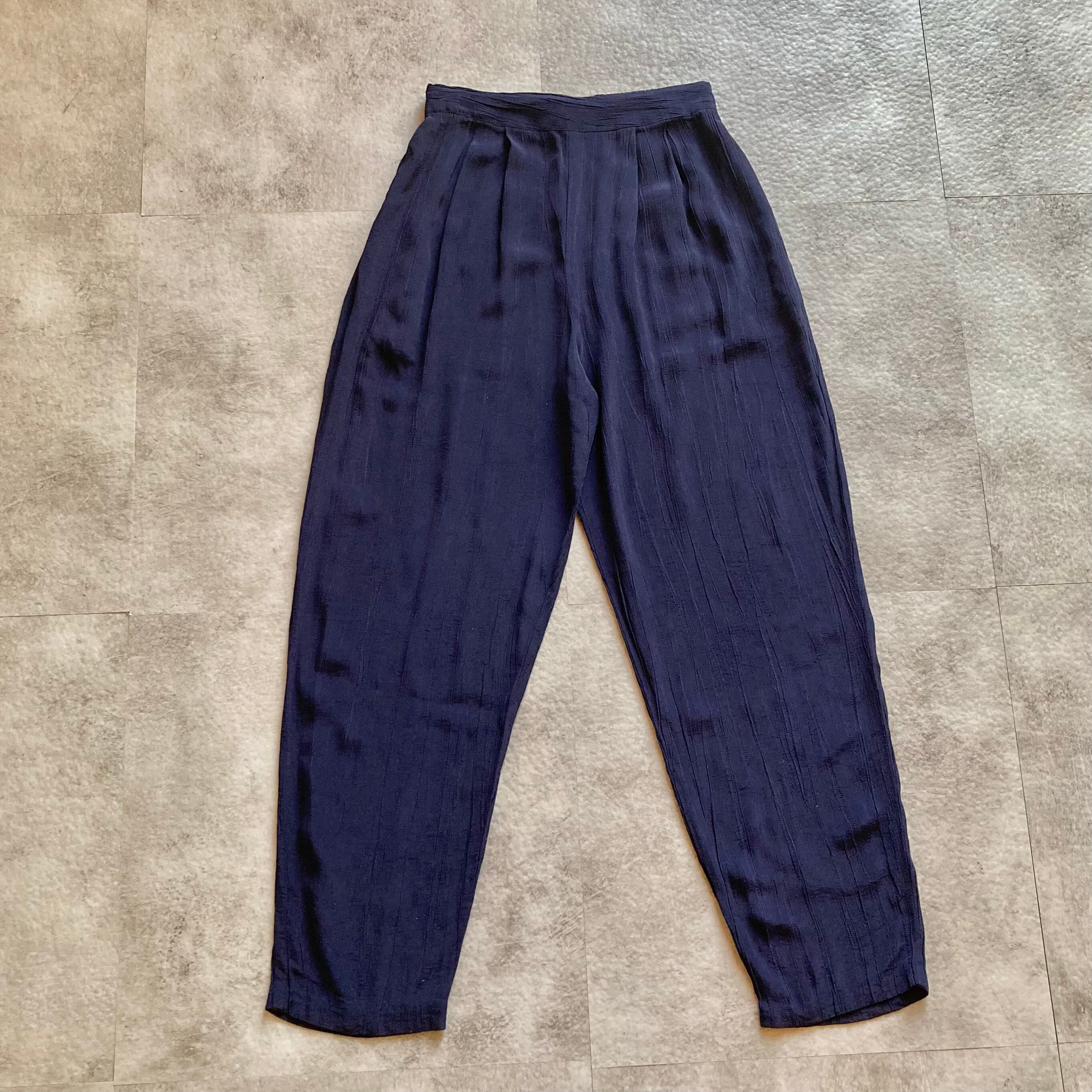 USA製のイージーパンツになります。レーヨン混合生地ですので、薄手で軽やかな清涼感のある生地感となっております。シルエットはキャロットパンツに近いかと思われます。ナス紺に近い落ち着いた雰囲気の色味ですので、様々な春夏のトップスと相性良いかと思います。