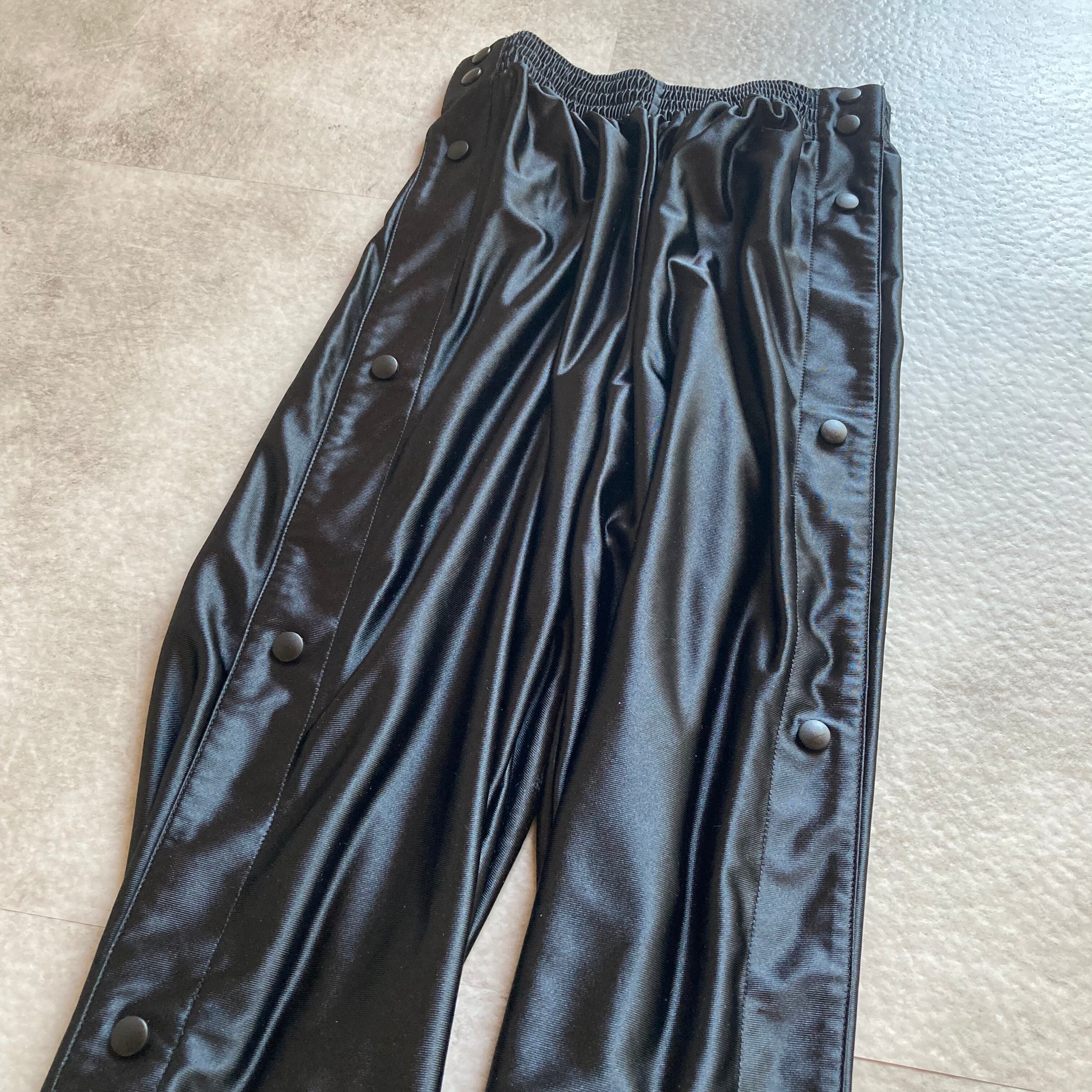 90s Nike のサイドボタン ポリエステルパンツになります。まるで レザーパンツのような雰囲気の光沢ある生地感に加え、ウエスト〜裾先までのサイドボタンが非常に個性的な一本です。ポリエステルですので薄手で軽やかな穿き心地となっており、 イージーパンツ のようにゆらゆらと波打つ姿も素敵です。