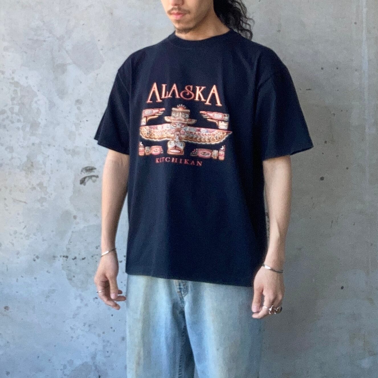 90s anvil のblack print teeになります。アメリカアラスカ州の都市 ケチカンのイラストロゴがデザインされた1着です。blackのボディに、きらりと光沢感のある刺繍が神秘的な雰囲気です。
