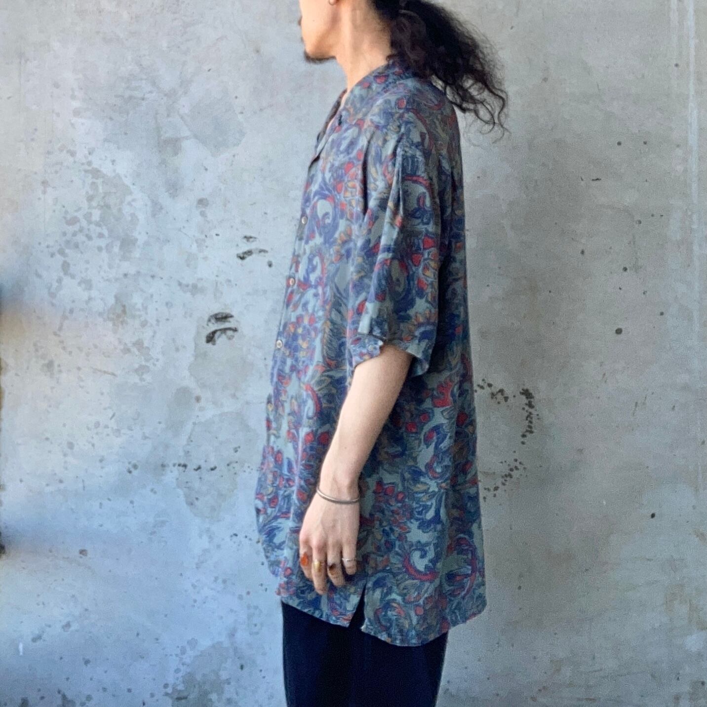 90s USA製 の総柄開襟レーヨンシャツになります。XL の オーバーサイズ ビッグサイズ ですので全体的にゆとりあるシルエットとなっており、ラフな雰囲気の1着です。 レーヨン100% のさらりとした着心地が気持ち良く、これからの夏時期に活躍してくれるかと思います。
