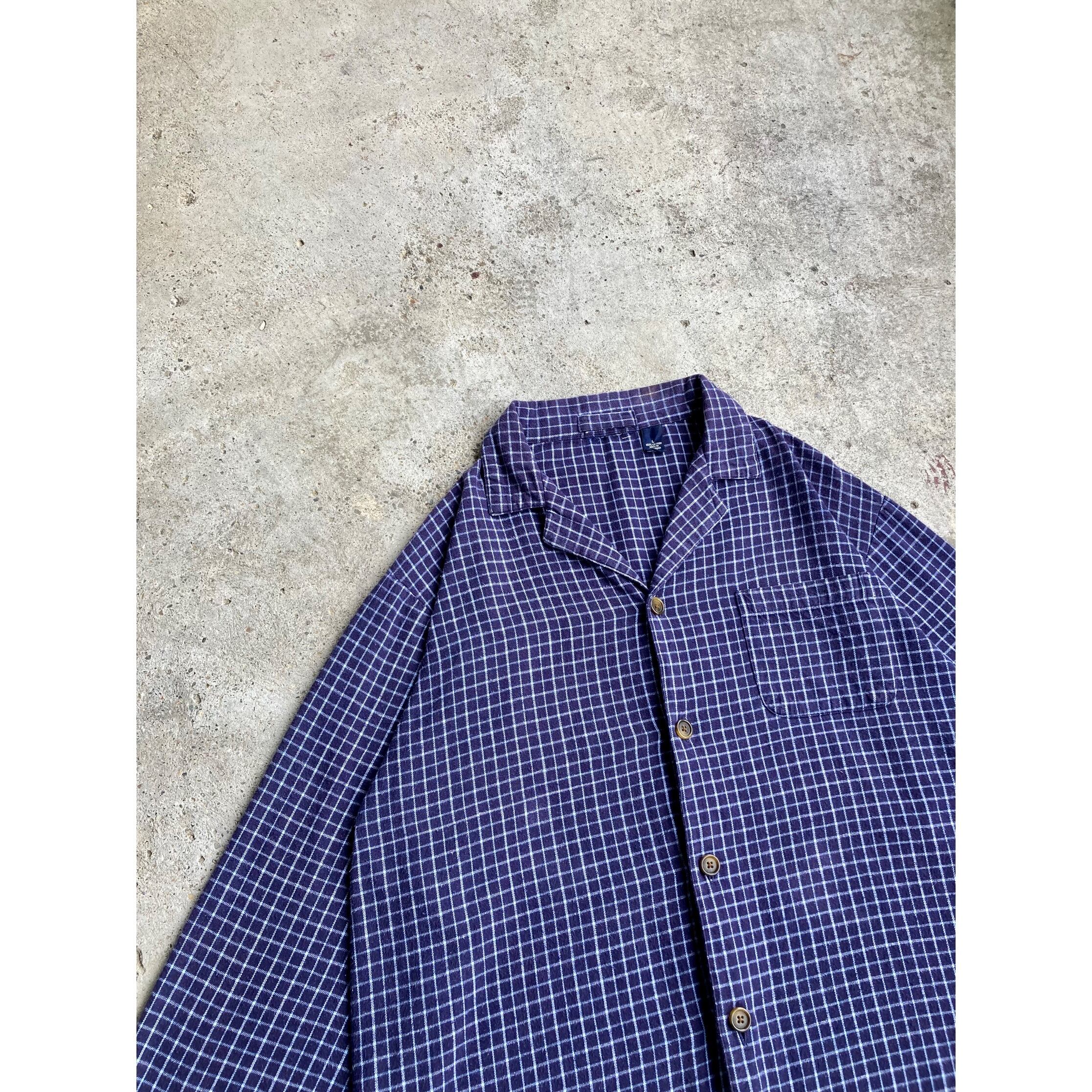 ネイビーカラーのチェックパジャマシャツになります。深めの開襟、太めのアームホールなど絶妙なシルエットの1着で、パジャマということもあり柔らかな着心地ですので、ストレス無く着て頂けるかと思います。