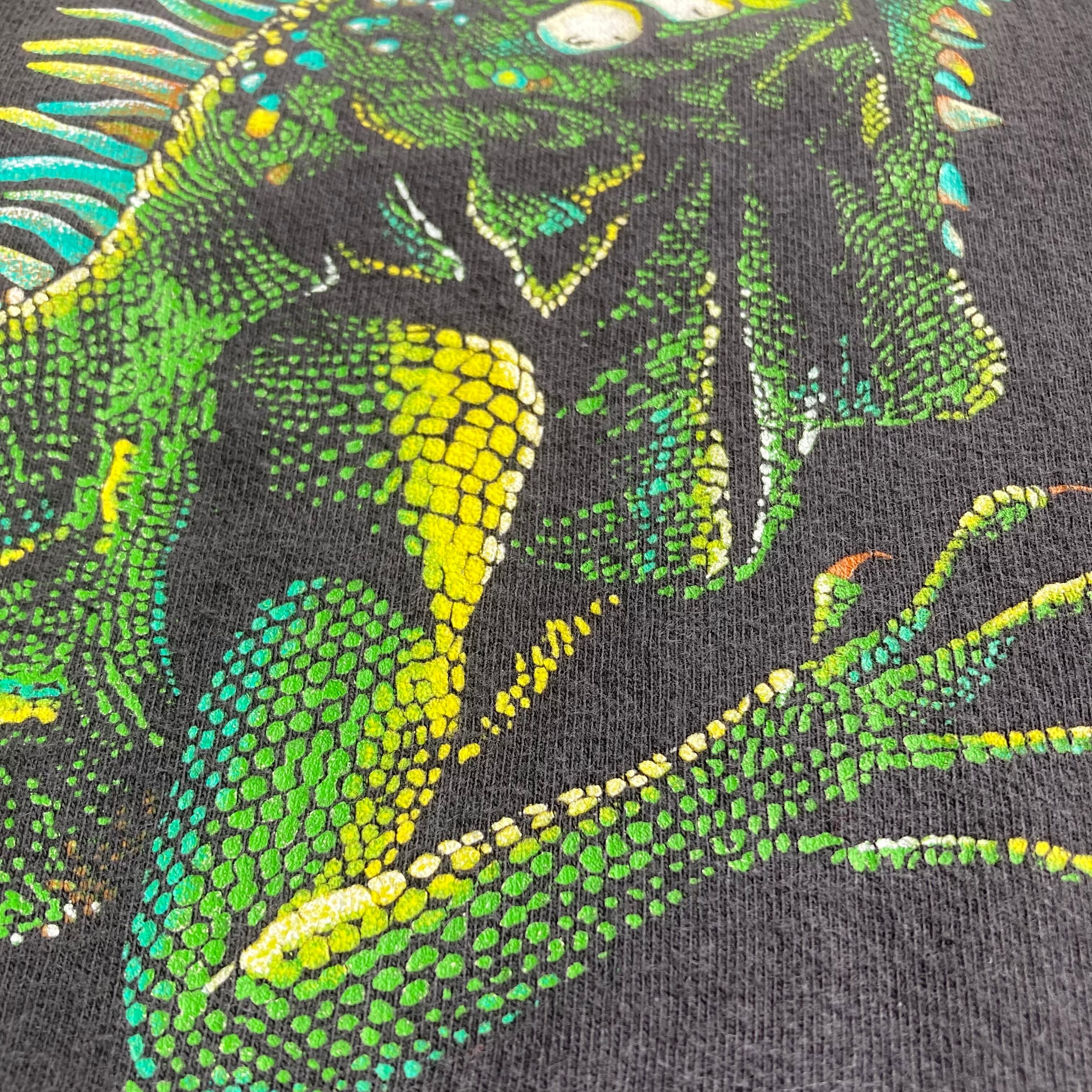 2匹のイグアナがサイドにプリントされた目を惹く1着です。サイズも2XLと オーバーサイズ ビッグサイズ シルエット ですので、非常に存在感のある1枚になるかと思います。イグアナがお好きな方や個性的なteeがお好きな方に是非おすすめです。