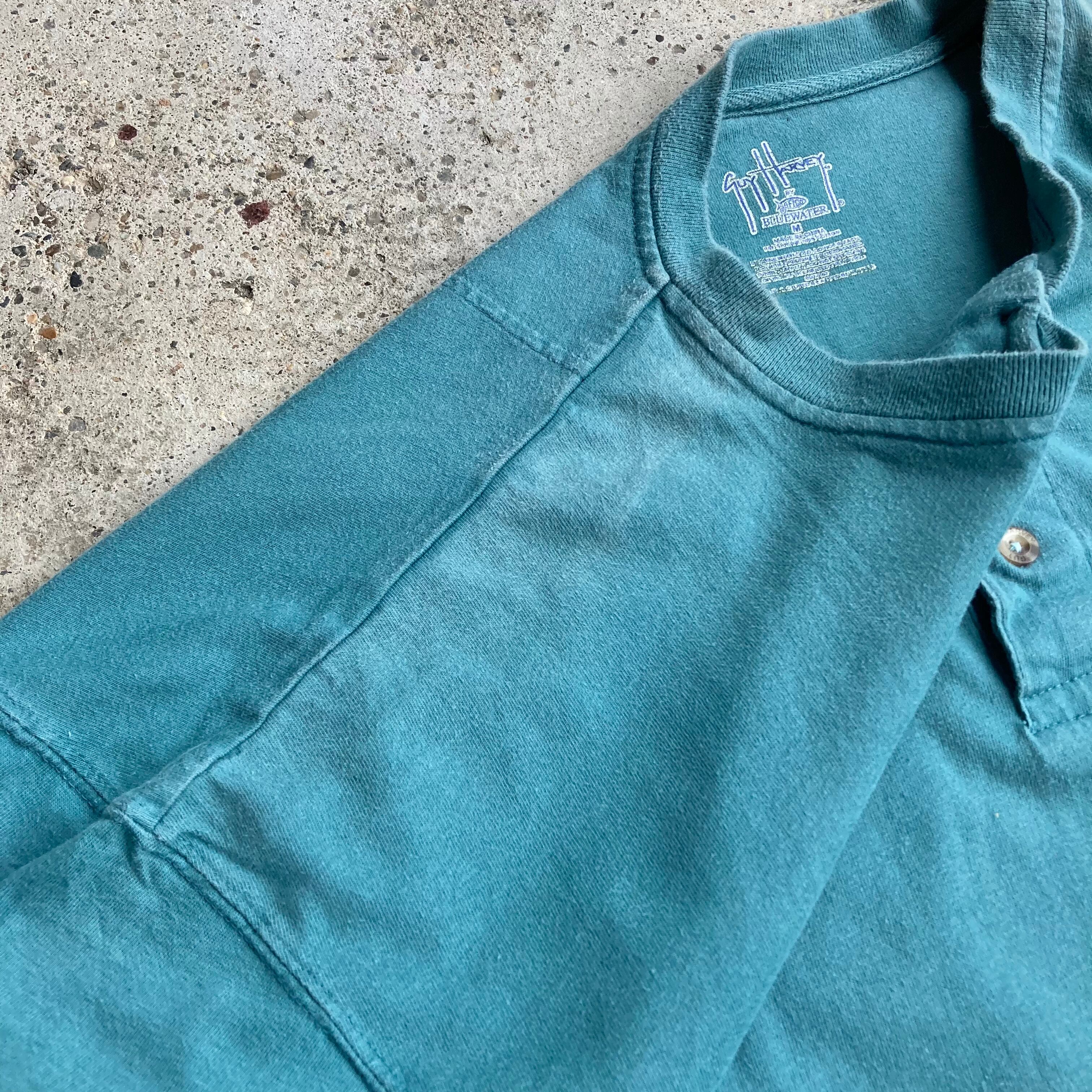 背面の魚プリントが個性的で目を惹くヘンリーネックTになります。ボディのブルーグリーンカラーも相まって、非常に夏らしく爽やかな雰囲気の1着かと思います。サイズ感もゆとりがあり、ゆるりとラフに着て頂けそうです。