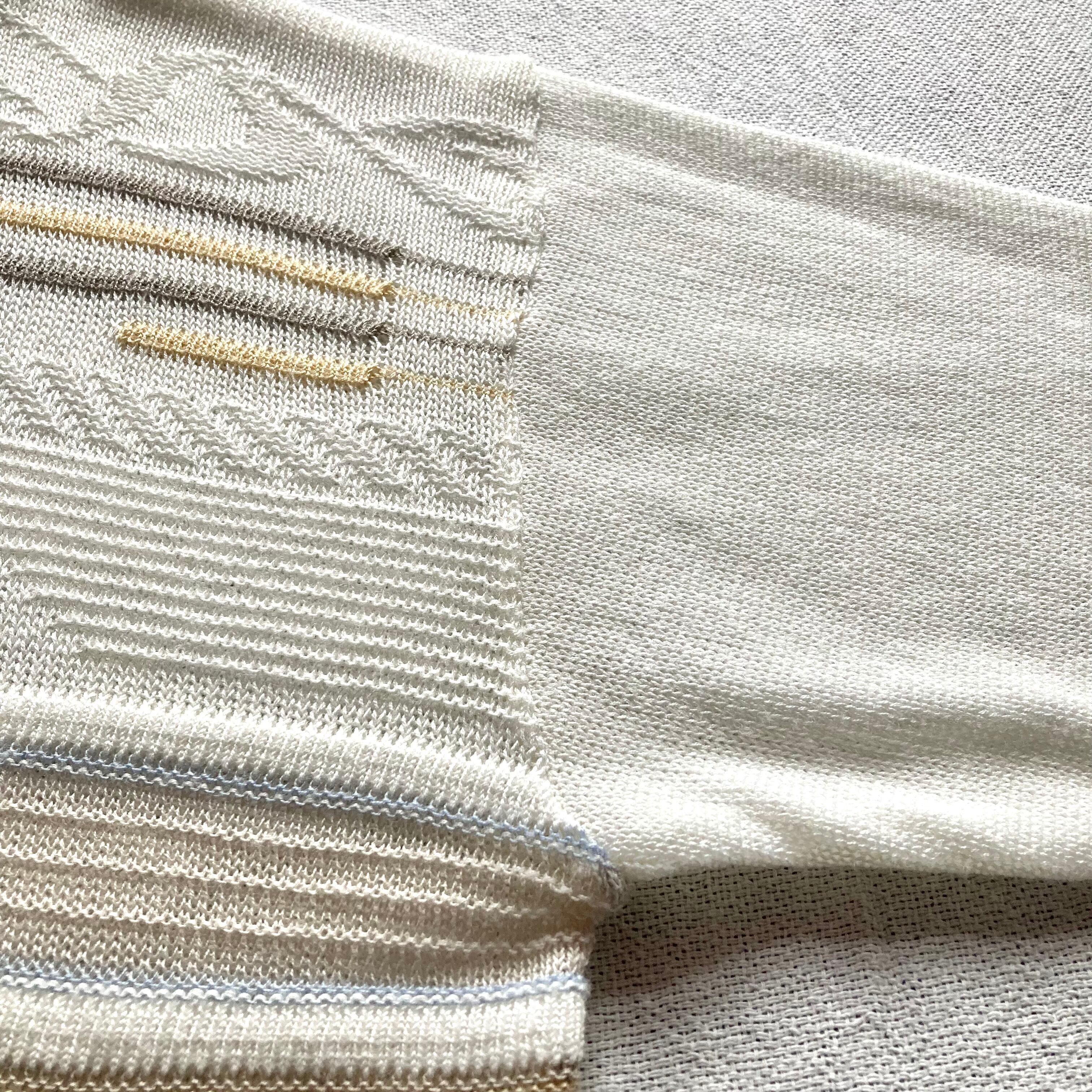 リネン配合生地のhalf sleeve sweaterになります。3Dニットのような凹凸のある生地感と、イエロー・ブルー系のカラーリングが特徴的な1着です。薄手で清涼感のある着心地ですので、春時期はセーターやスウェットと一緒にレイヤードして着て頂くのがおすすめです。