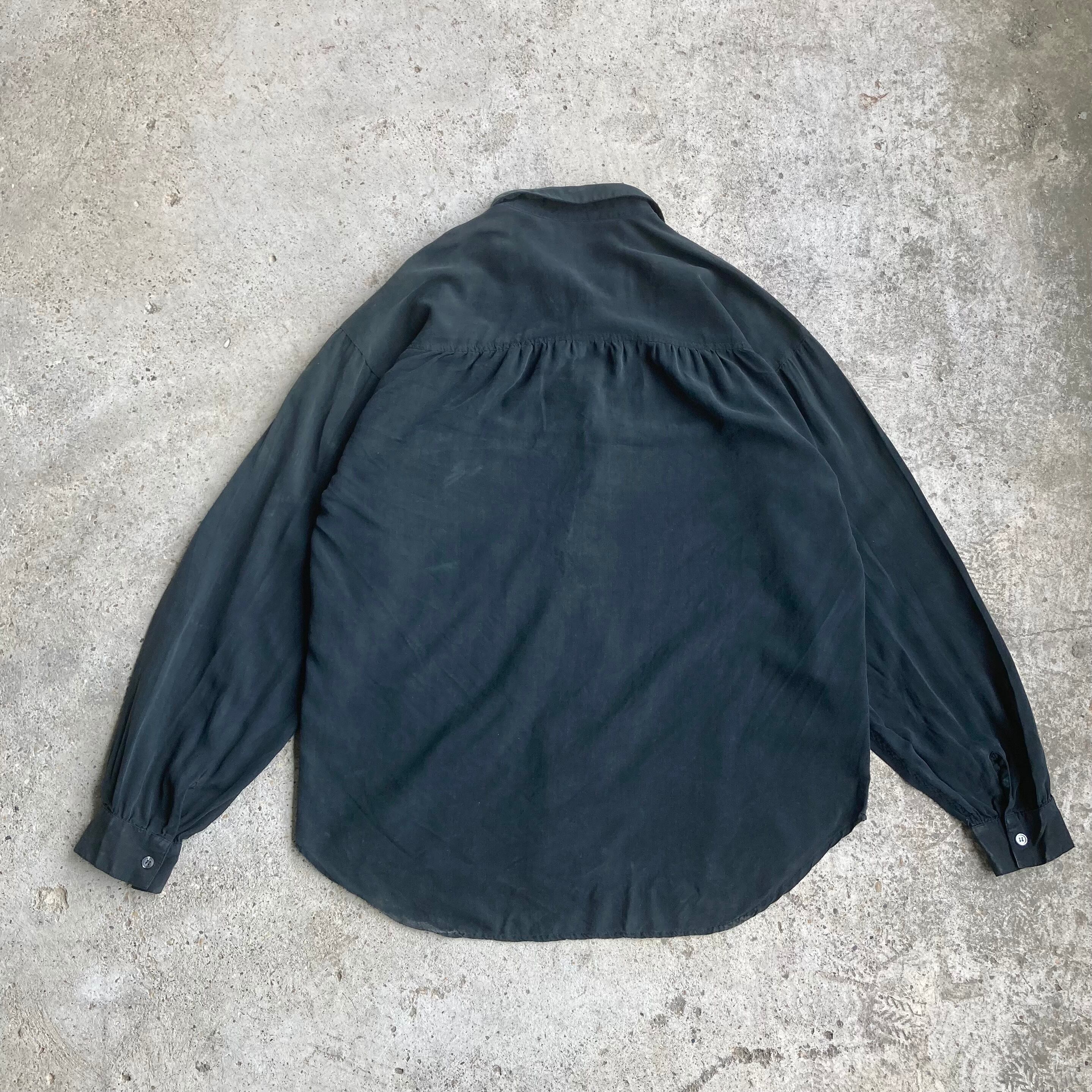 silk100%のblack shirtになります。silk独特のうっすらと光沢感のある、プルプルとした軽やかな生地感が特徴的の1着です。今の時期はshortsに合わせて頂くと素敵な雰囲気になるかと思います。