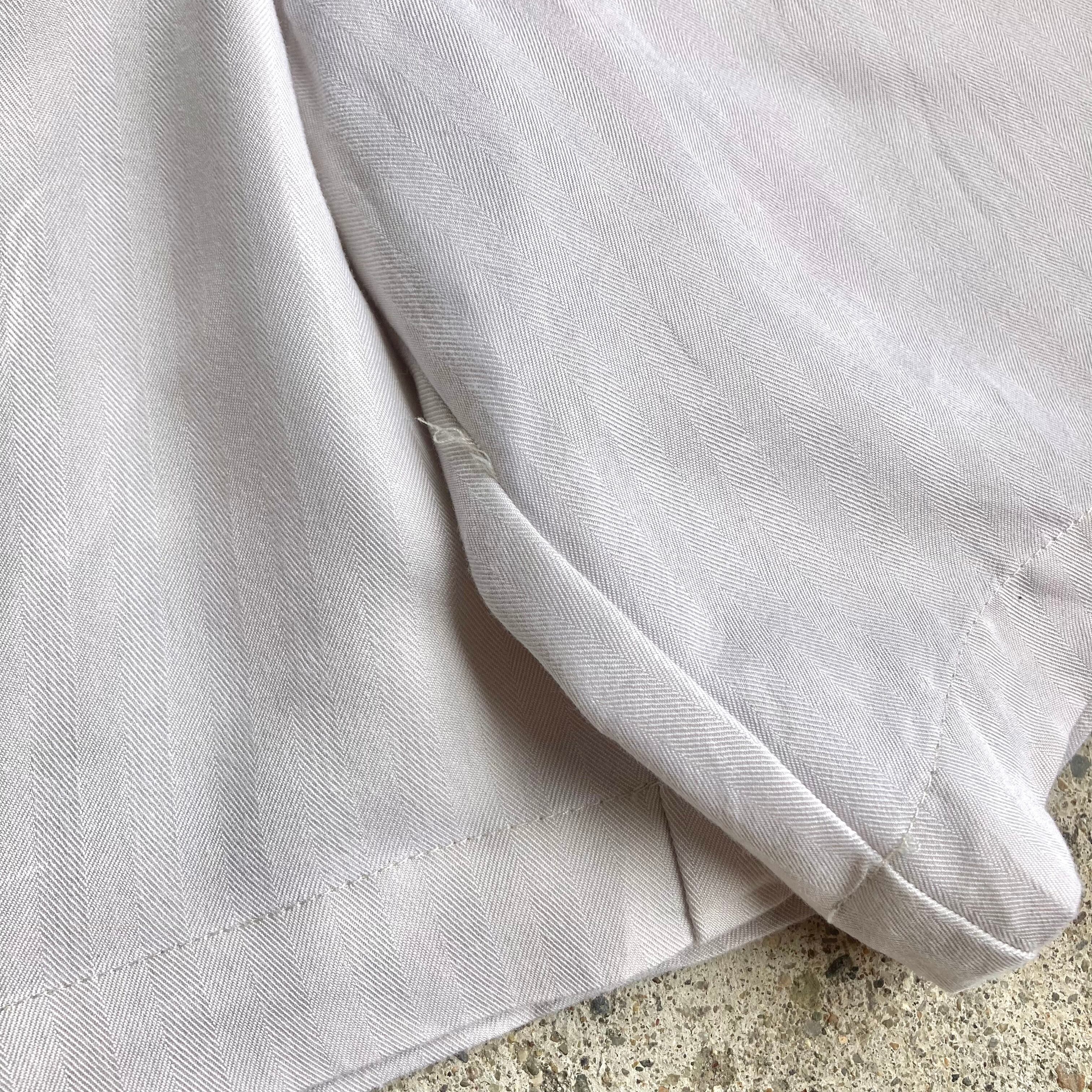 rayon混合生地のshortsになります。爽やかなivory colorに、ゆとりあるシルエットが特徴的な1着です。rayon特有の滑らかでサラサラした生地感が穿いていて気持ち良いです。随所のシェルボタンも雰囲気良く素敵です。