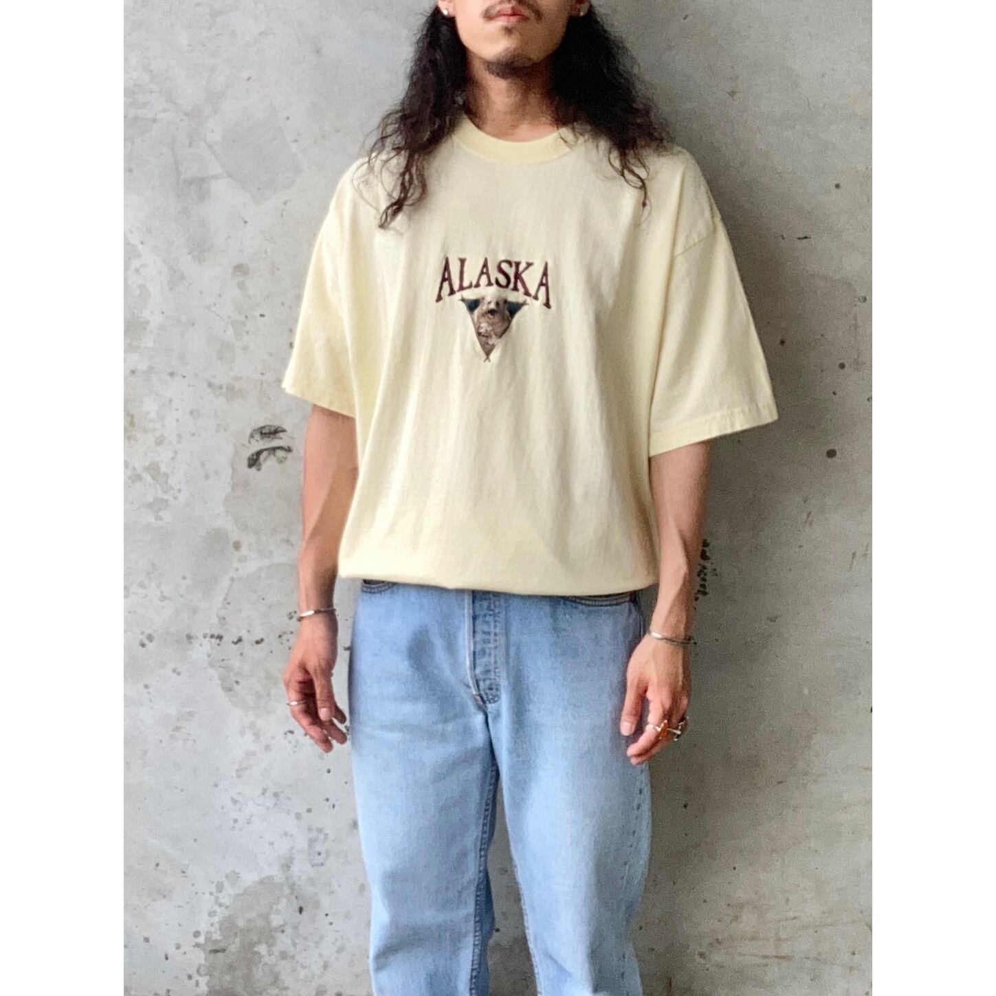 爽やかなライトイエローの bodyに、シロクマ親子と "ALASKA" の刺繍が入ったteeになります。