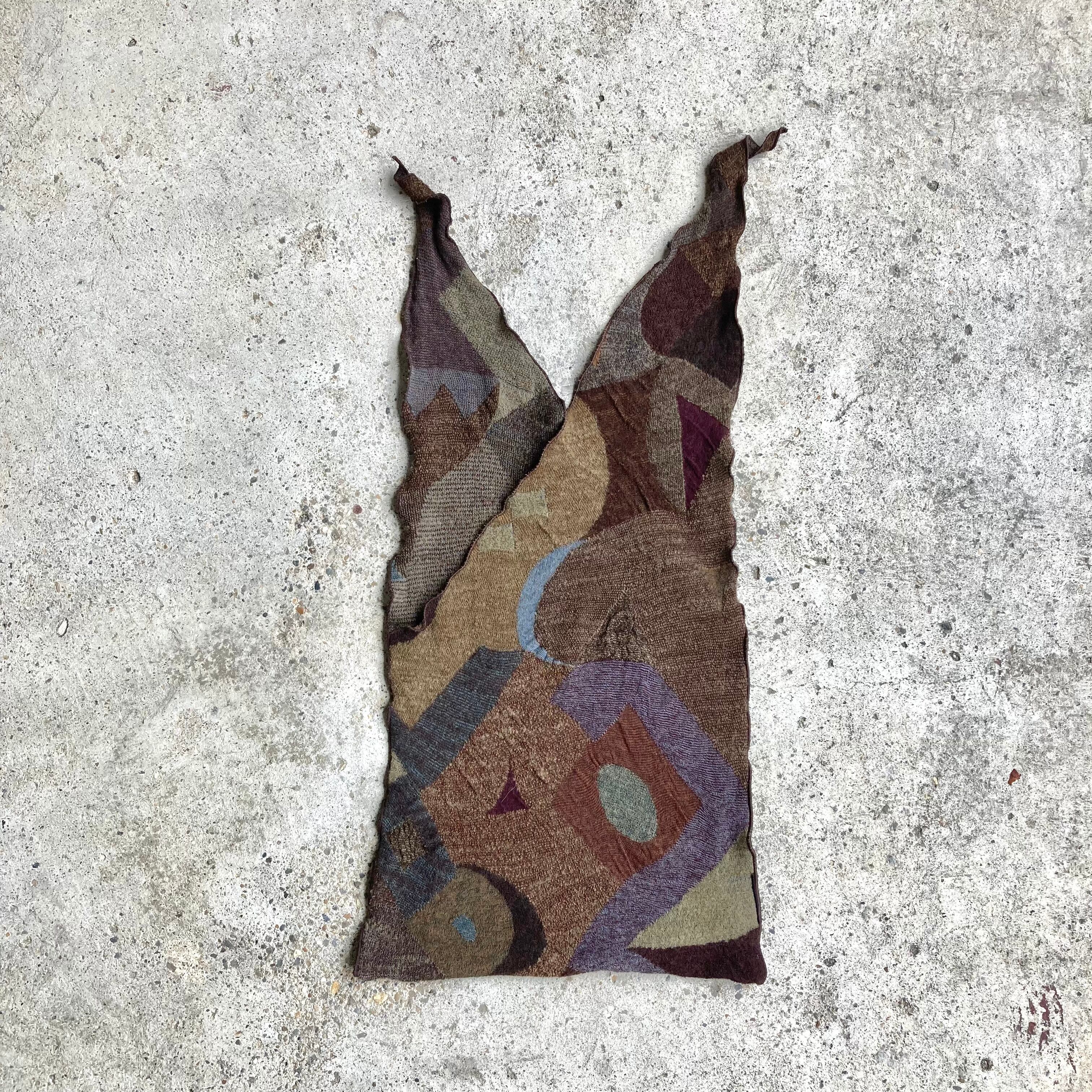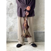 持ち手を結ぶタイプのhand bagになります。表記無しですが、タオル地 パイル地 のようなフワフワとした気持ち良い生地感となっております。ブラウンベースの落ち着いた色味に、レトロな雰囲気の総柄も非常に可愛らしいです。