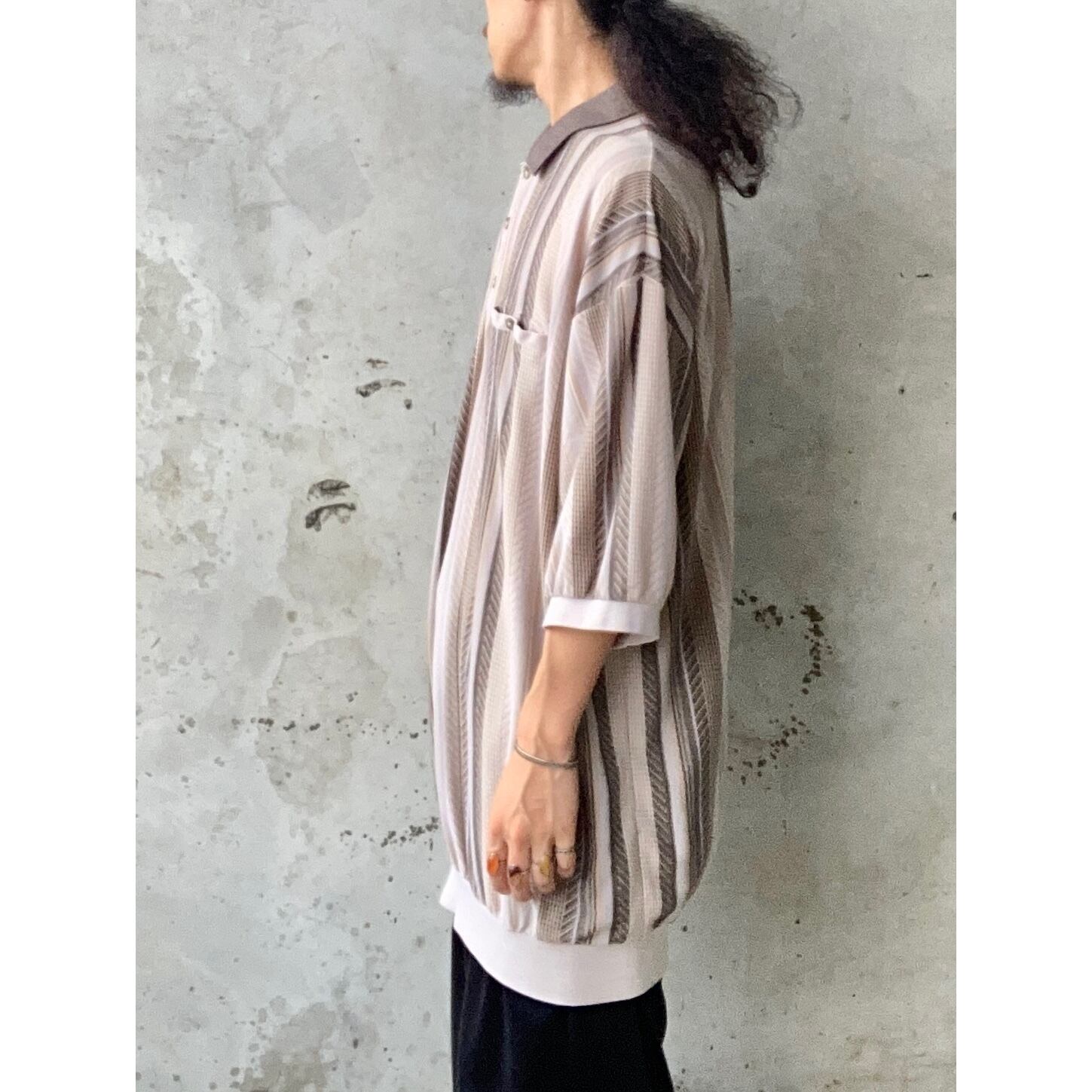 落ち着いた雰囲気のあるアースカラーストライプのポロシャツになります。2XLの オーバーサイズ ビッグサイズ ですので、緩い着こなしがお好きな方におすすめの1着です。ワントーンでまとめるのも可愛らしいかと思います。