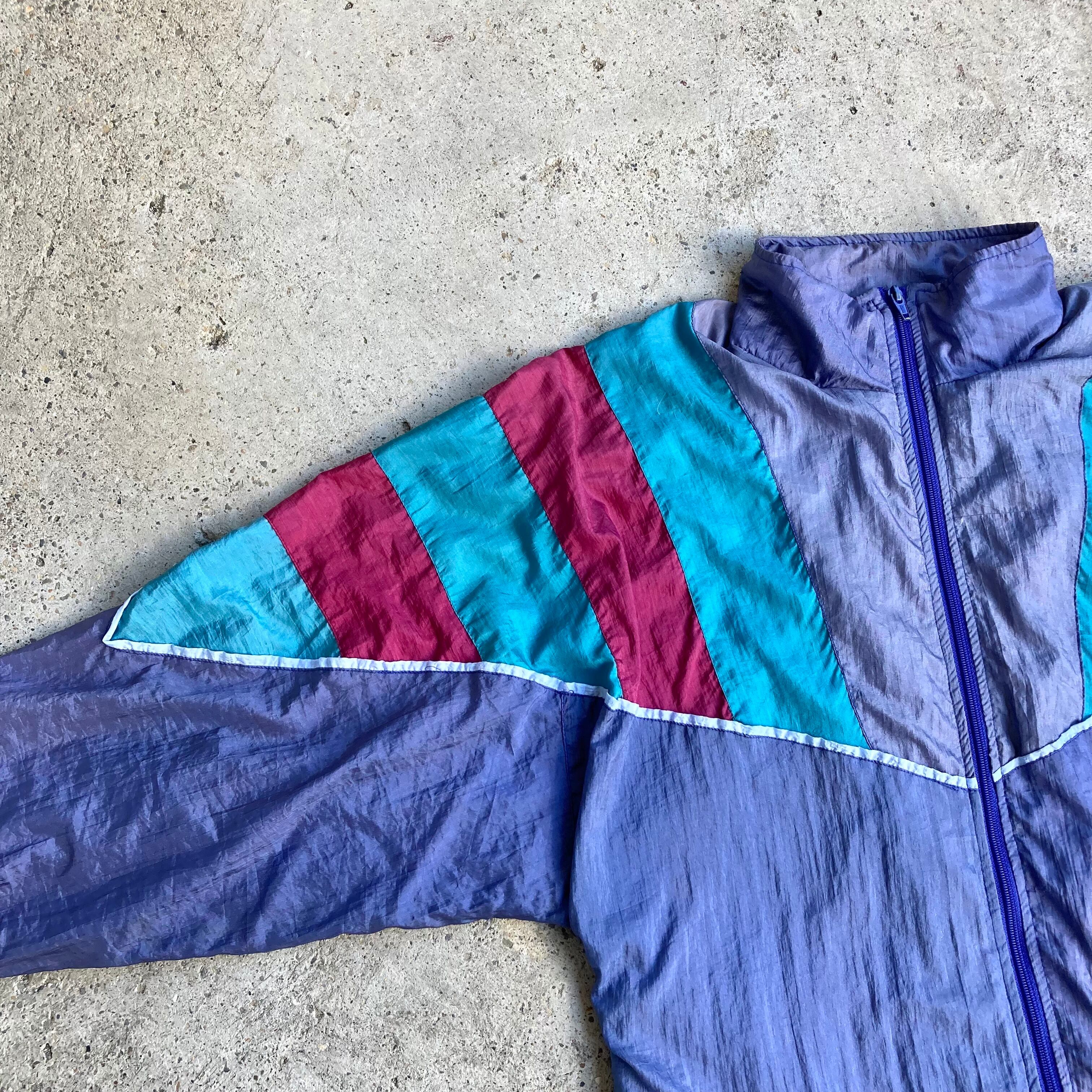 クラシカルなデザインが特徴のスポーツジャケット ナイロンジャケット になります。胸元からアーム部分にかけての鮮やかなストライプデザインが目を惹く1着です。