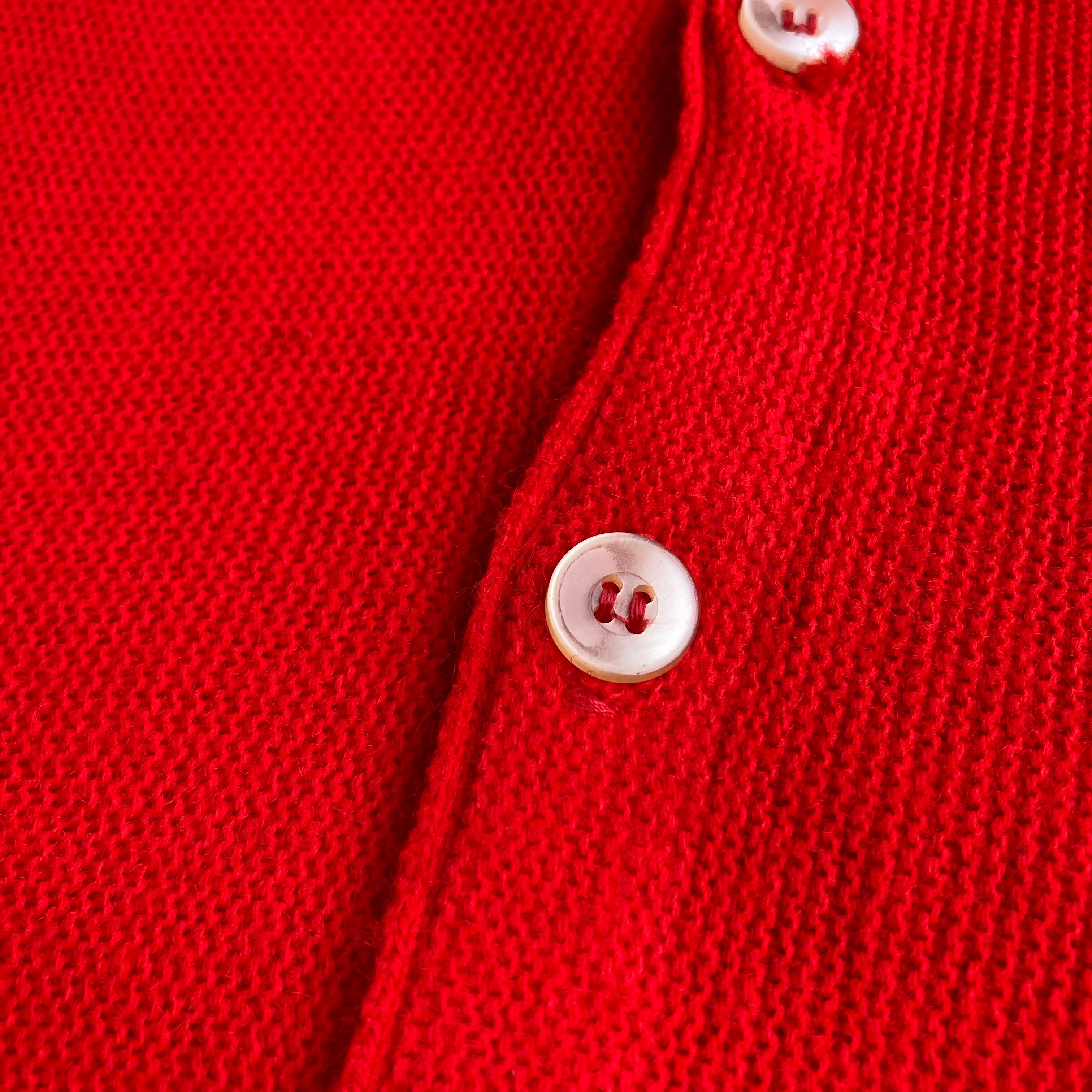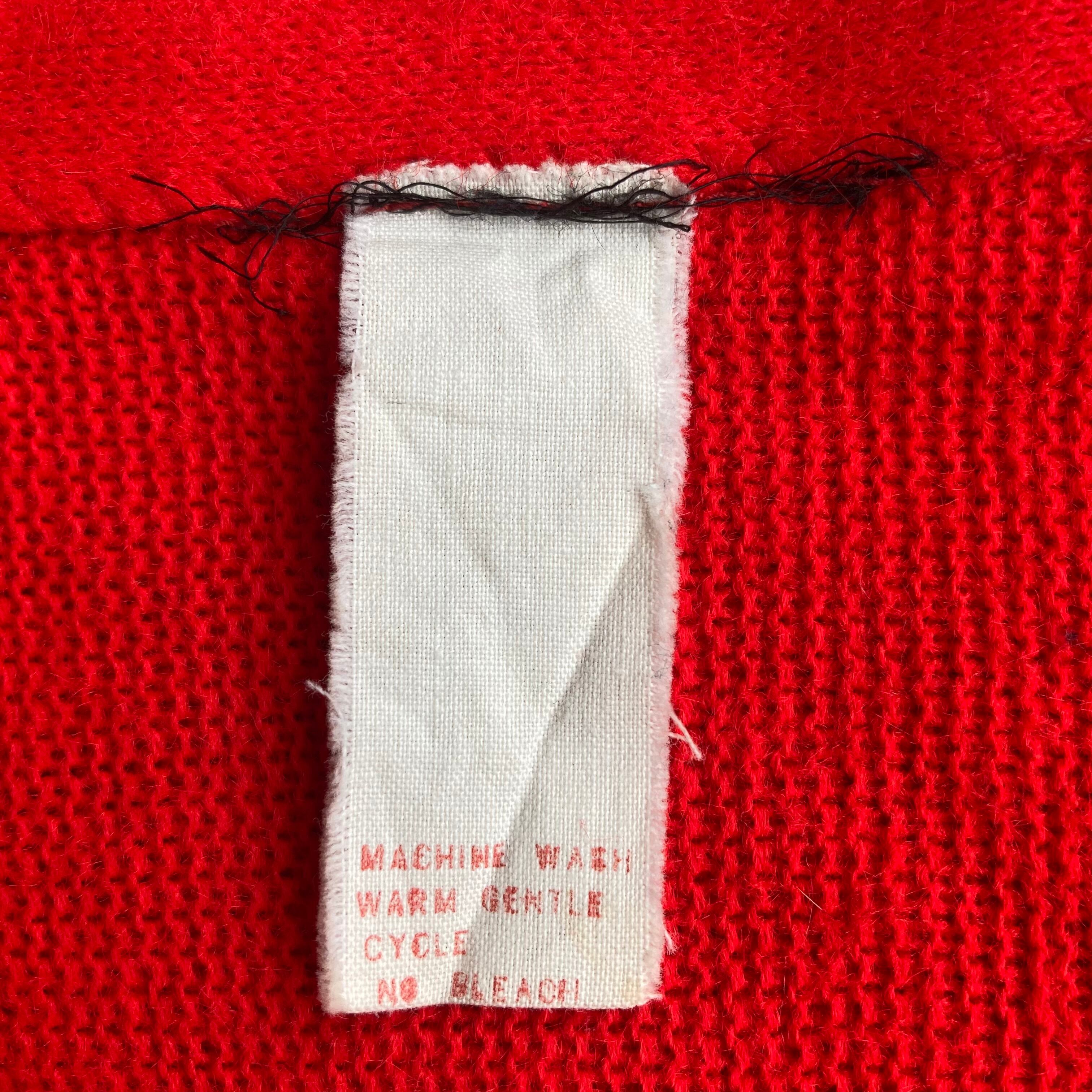 鮮やかなレッドカラーが特徴的なアクリルカーディガンになります。詳細不明ですが70s〜80s頃にかけての1着かと思われます。
