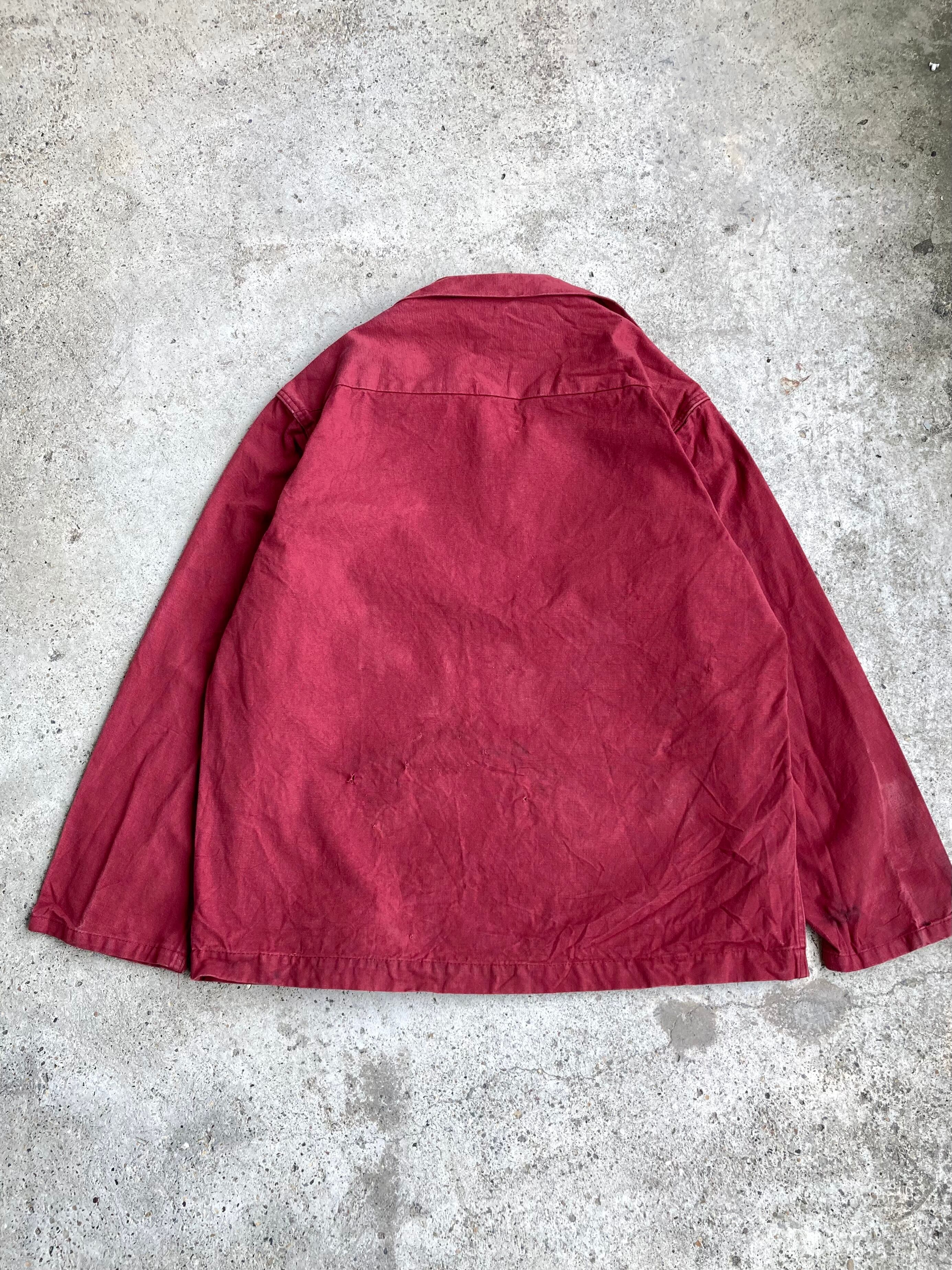 50s〜60sにかけてのfisherman smock になります。やや燻んだレッドピンクの色味と、ガシッと硬めの肉厚コットン生地、フロントのプルオーバー仕様が特徴的な1着です。Franceのマリンウェアの老舗であるLE GLAZIK製です。