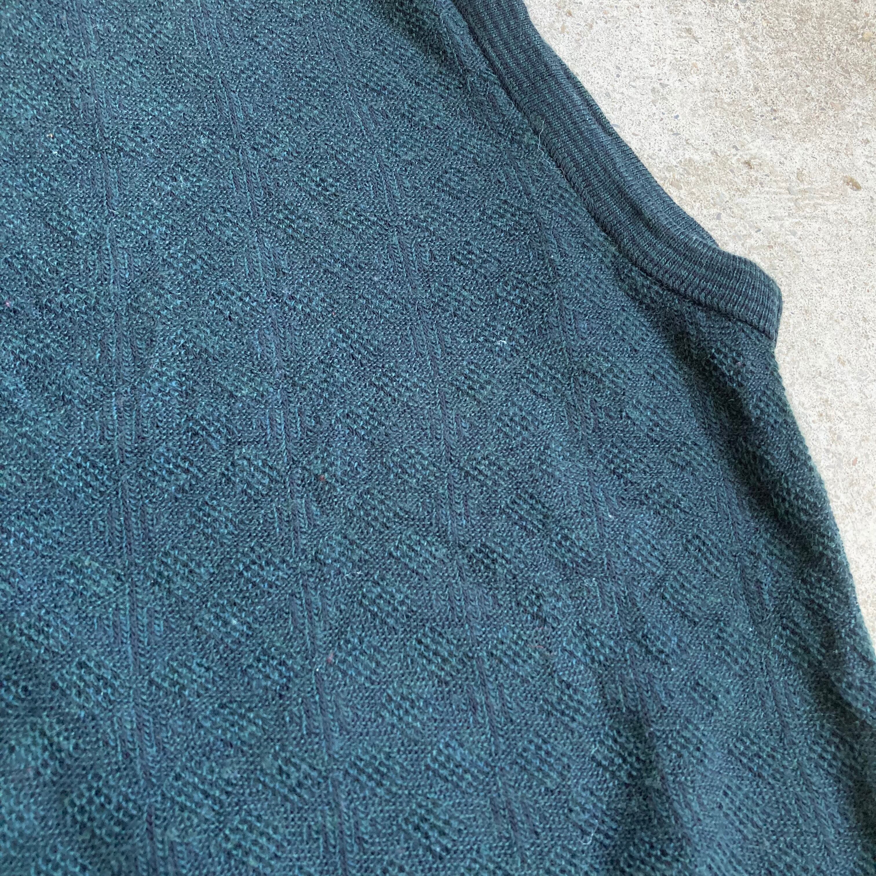 写真だと伝わりにくいですが、ブラックに近いダークグリーンカラーをしております。近くで見ると総柄の編み地が分かり、さりげなく素敵な雰囲気です。XLの オーバーサイズ ですので、ロンTなどにラフに合わせて頂けそうです。