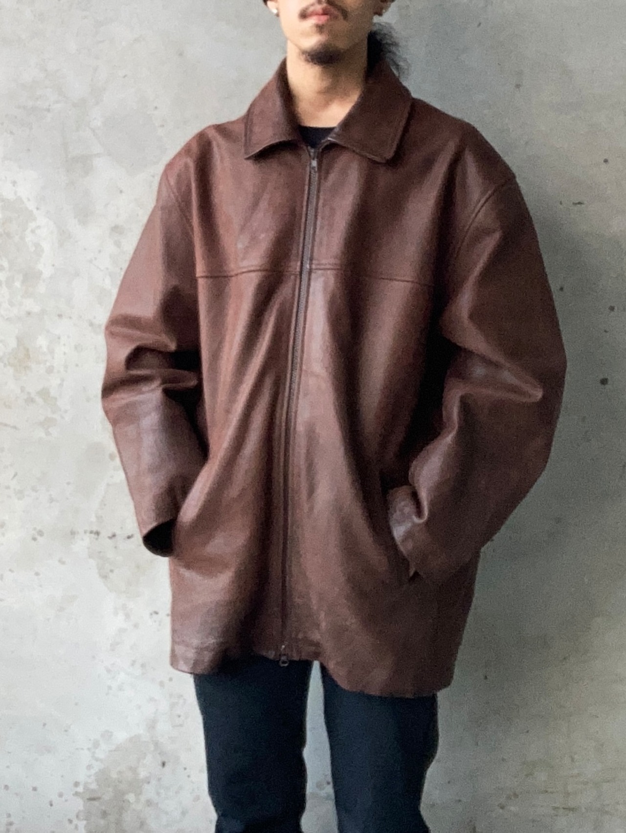 brownのレザージャケットになります。非常に味のある渋い雰囲気の1着です。重厚感がありますので、まさしくレザーを着ているという感覚になれるかと思います。XLの オーバーサイズシルエット 、ダブルジッパー仕様、ライナー取り外し可能ですので、可能性にも優れております。