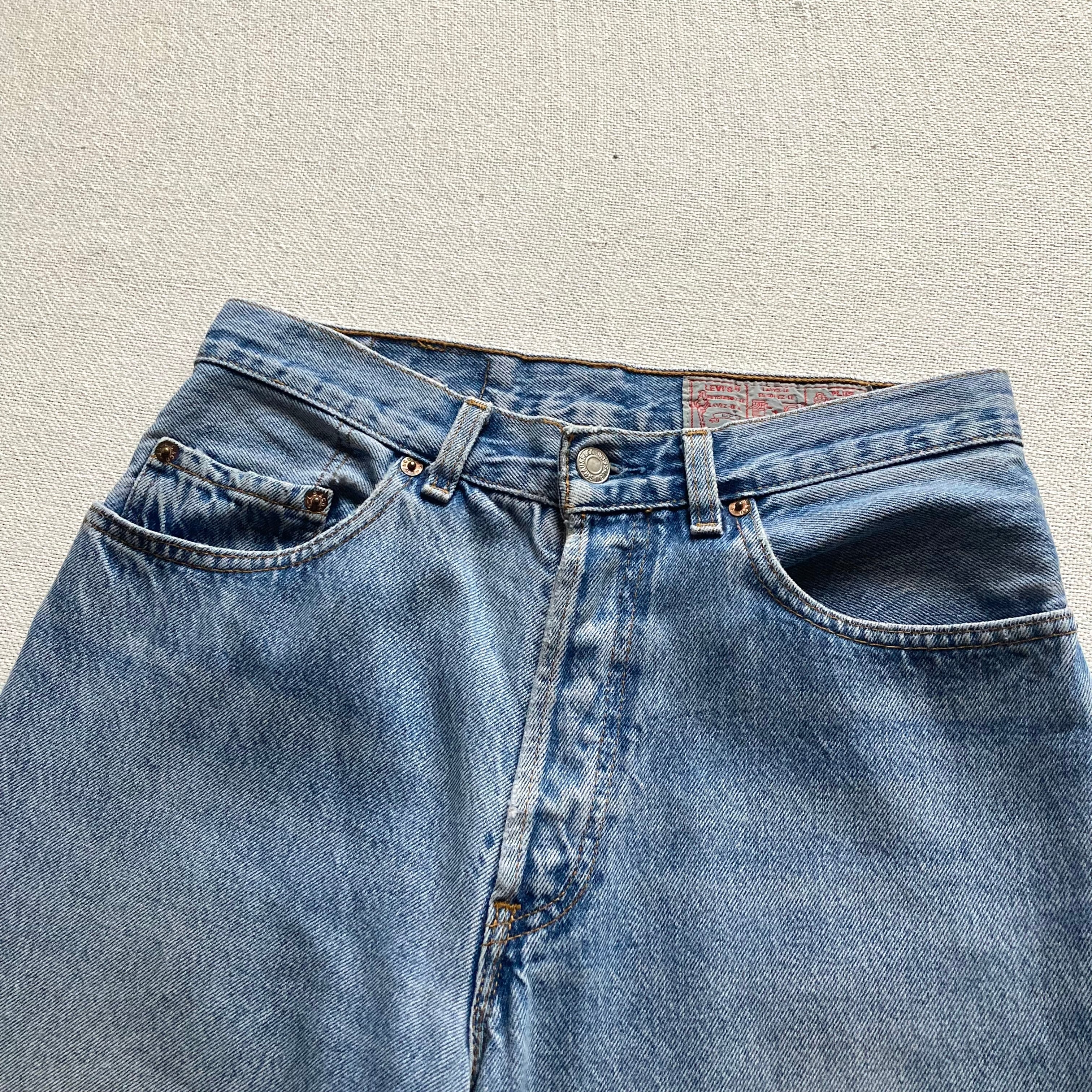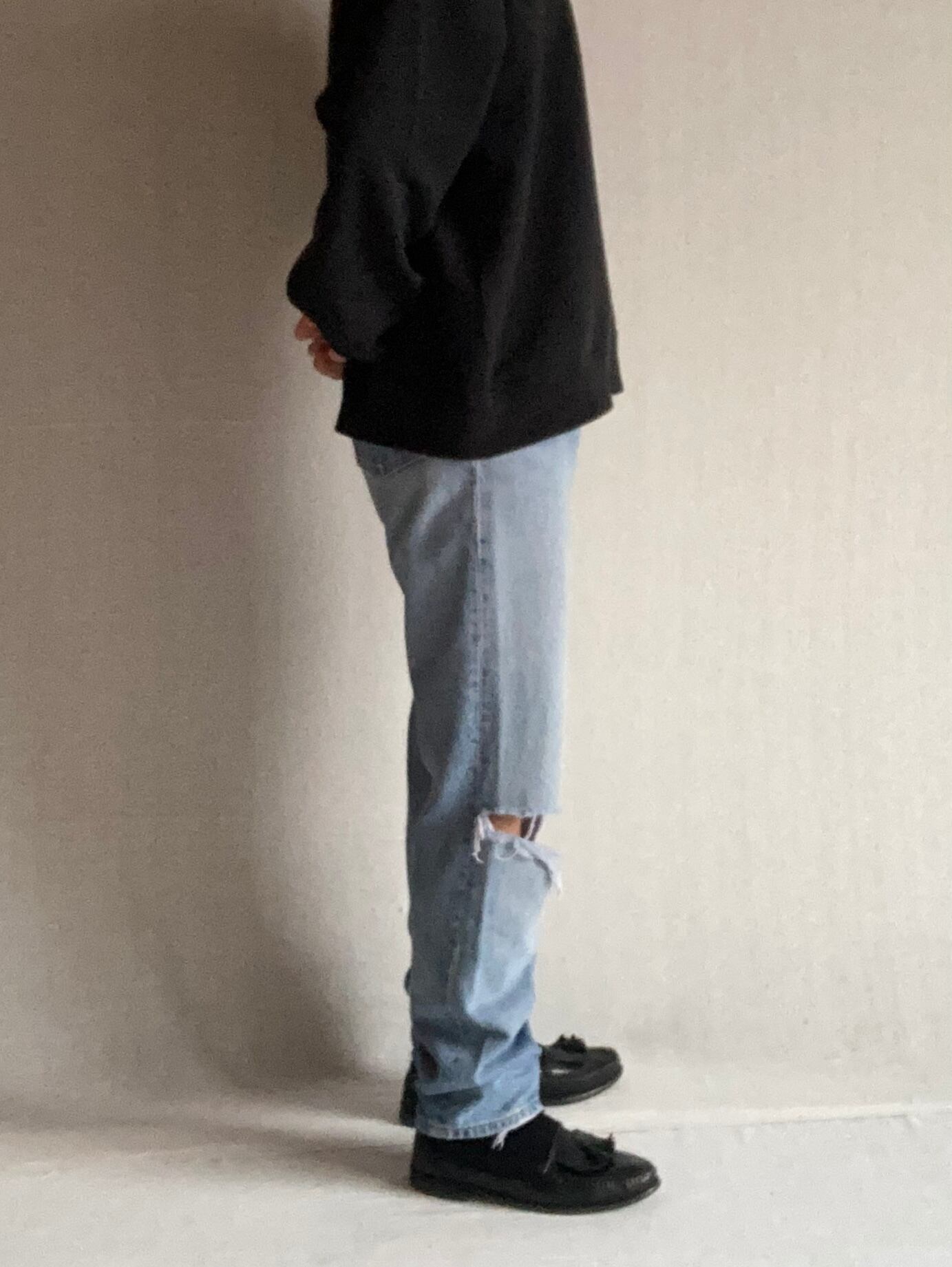 90s France製のEuro Levisになります。程よく細身のテーパードシルエットに、右膝のダメージ感が非常に雰囲気の良い一本です。