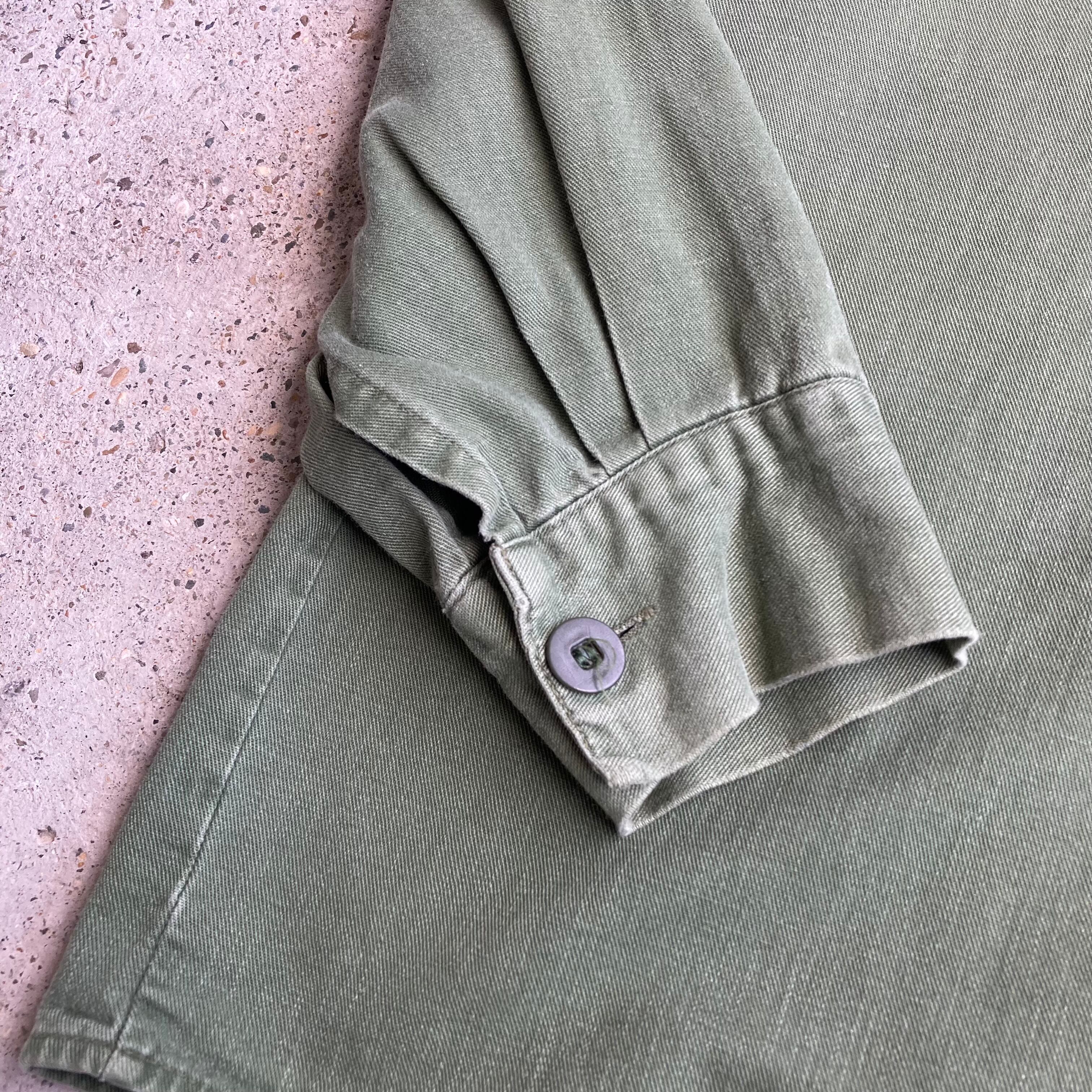 80s スウェーデン軍のm-55 スリーピングシャツになります。オリーブの色味の雰囲気と程よくゆとりのあるシルエットが絶妙な1着です。