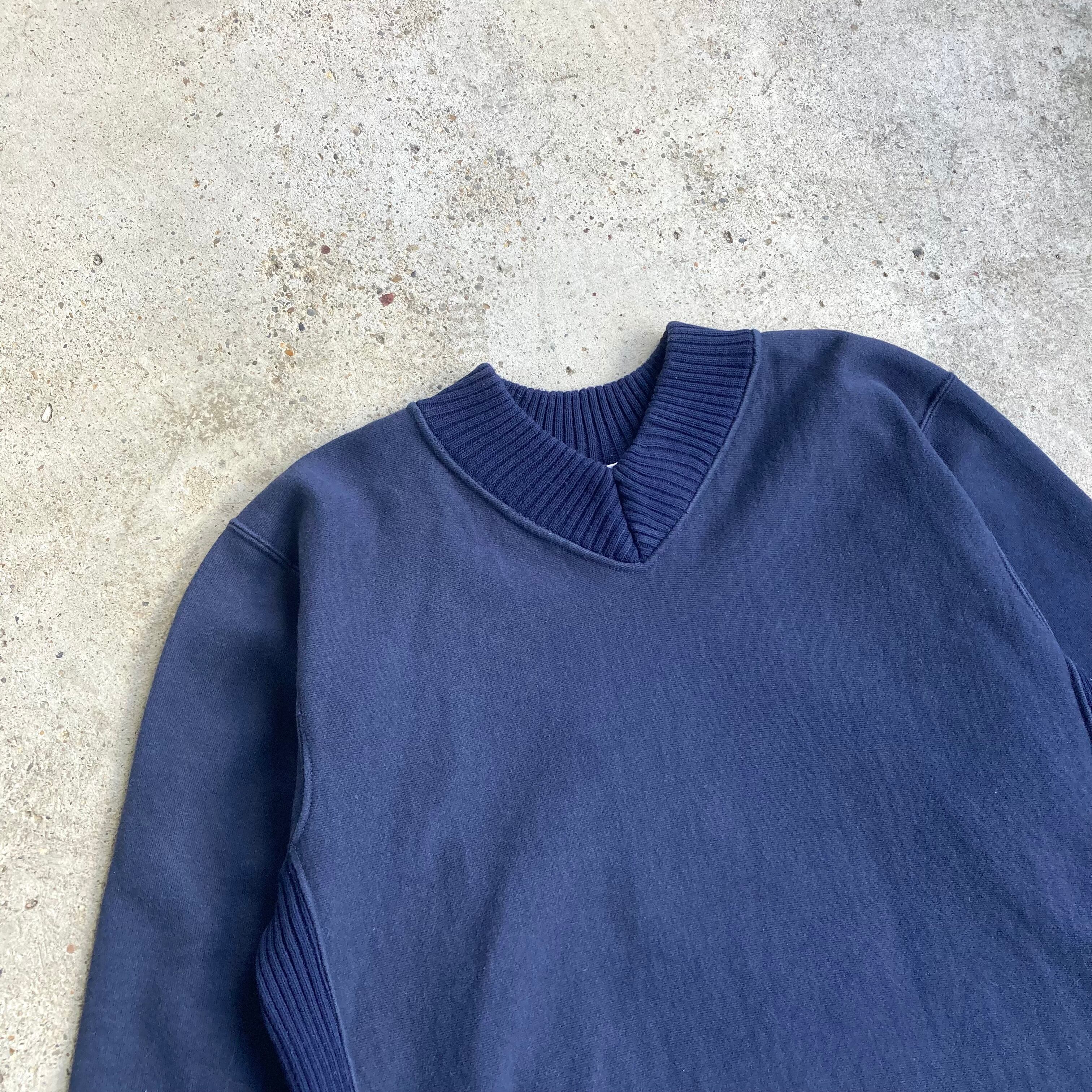 Vネック部分やボディサイドに施されたリブデザインが特徴的な1着です。厚手のしっかりとした生地感で、サイズもXLでゆとりが御座いますので、ゆったりとラフに着て頂けるかと思います。