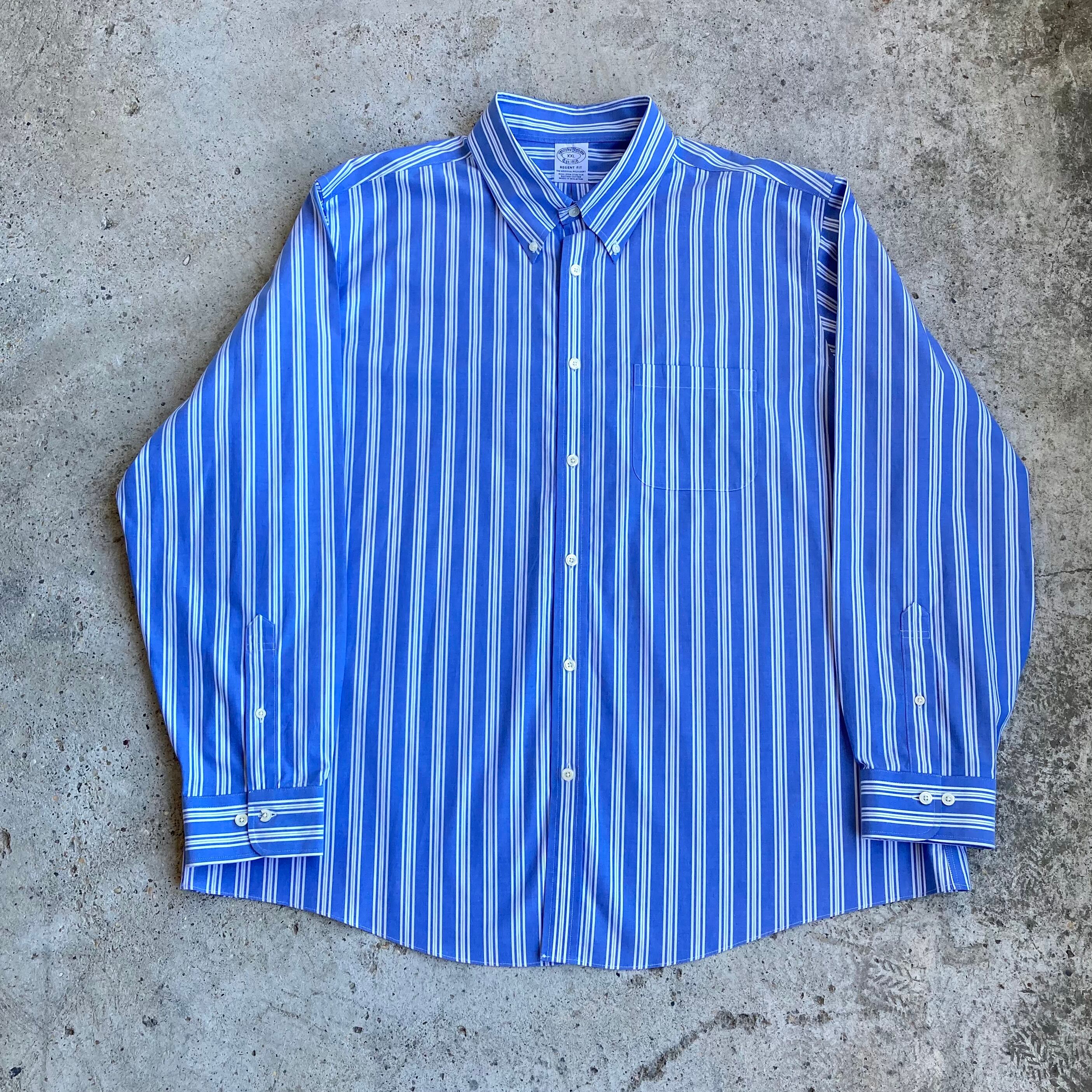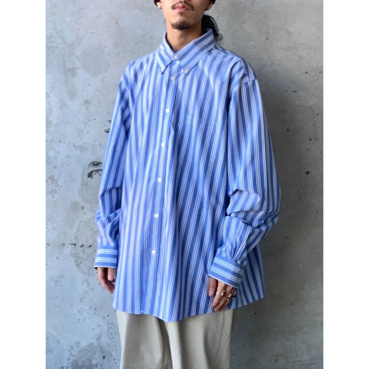 Brooks Brothersのボタンダウンストライプシャツになります。爽やかな雰囲気のブルーストライプにボタンダウン、XXLの オーバーサイズ シルエット が特徴的な1着です。緩くダボっとしたスタイルがお好きな方におすすめの1着です。