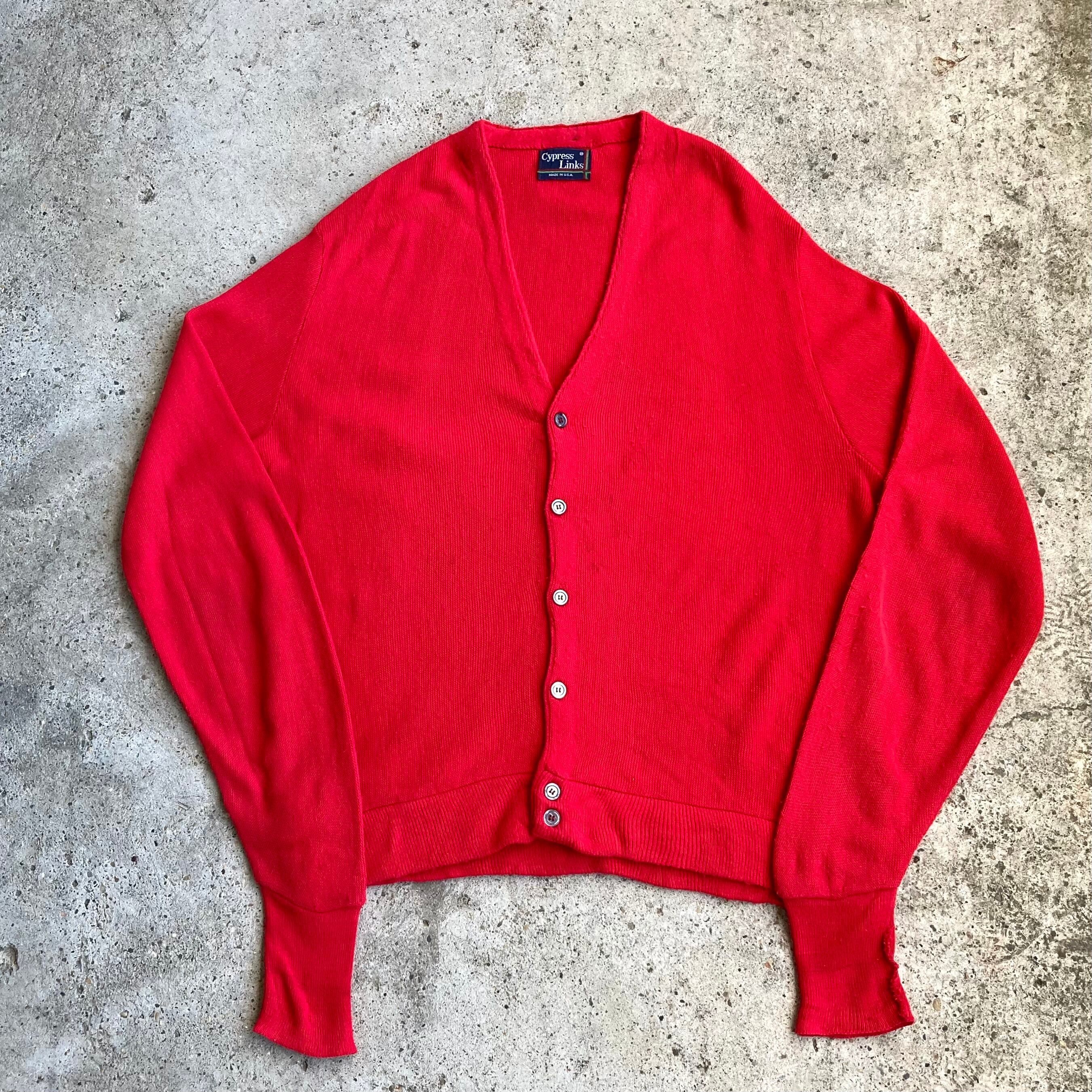 鮮やかなレッドカラーが特徴的なアクリルカーディガンになります。サイズM表記ですが、着用感はゆったりとL程度ありそうです。ダークトーンになりやすい冬のスタイルに、パキッとした明るめの色が入ると気分も上がりそうです。