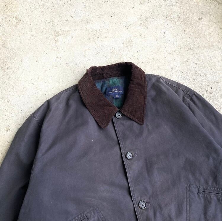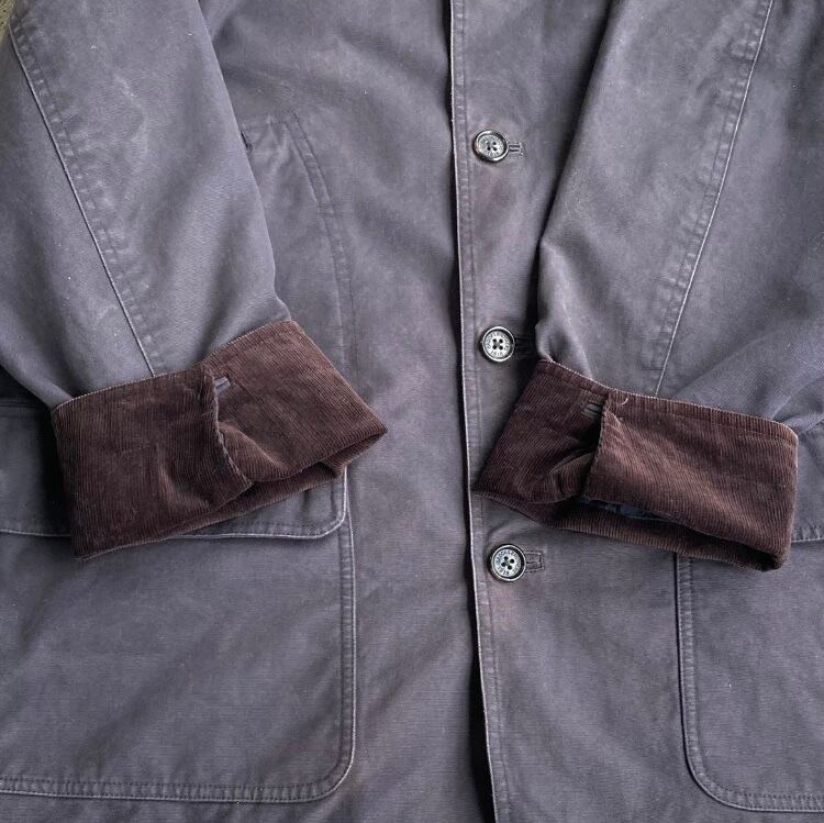 襟と袖部分にコーデュロイの切り替えがデザインされたカバーオールになります。ネイビー×ブラウンのナイスカラーリングの1着です。