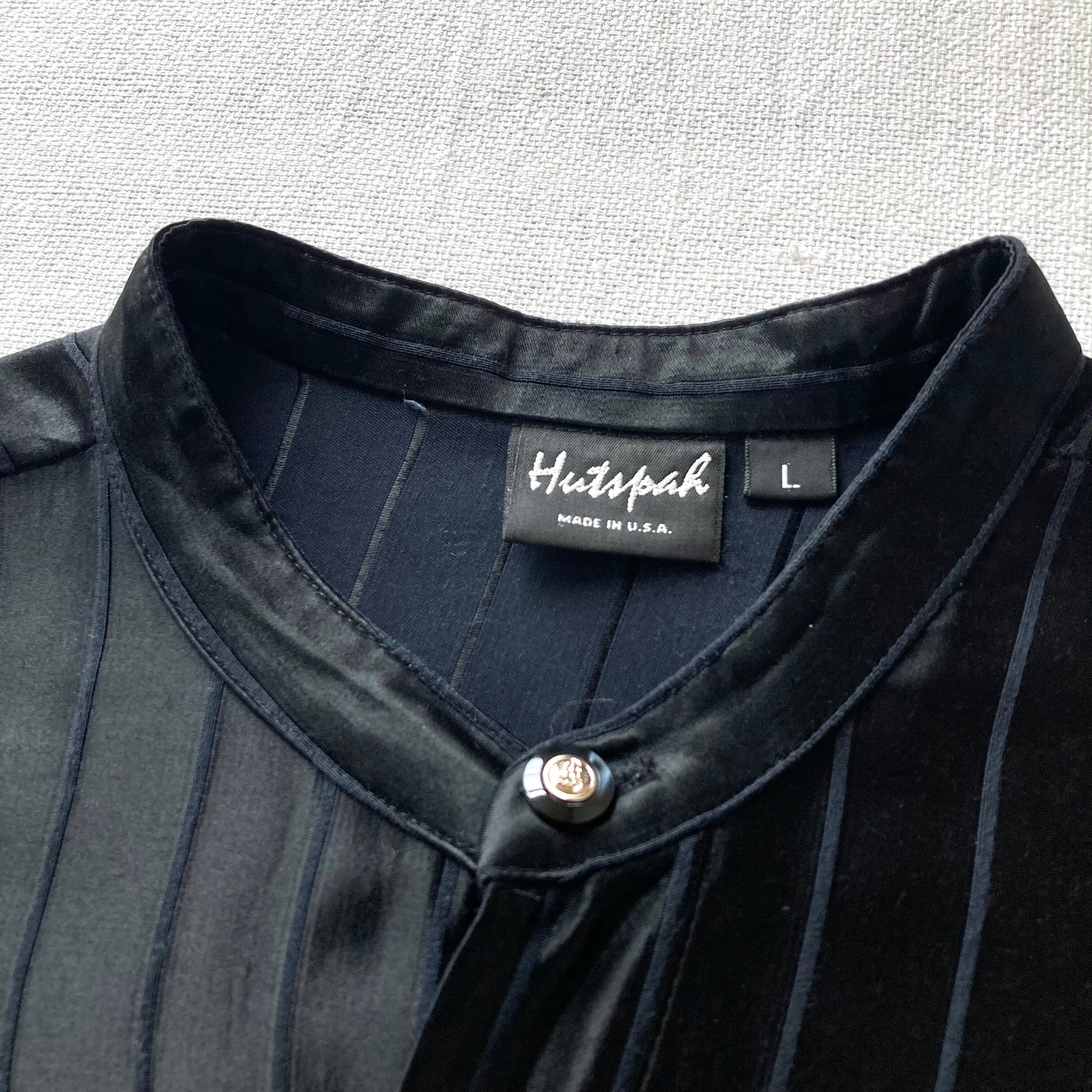 ブラックの光沢感が特徴的なバンドカラーストライプシャツになります。