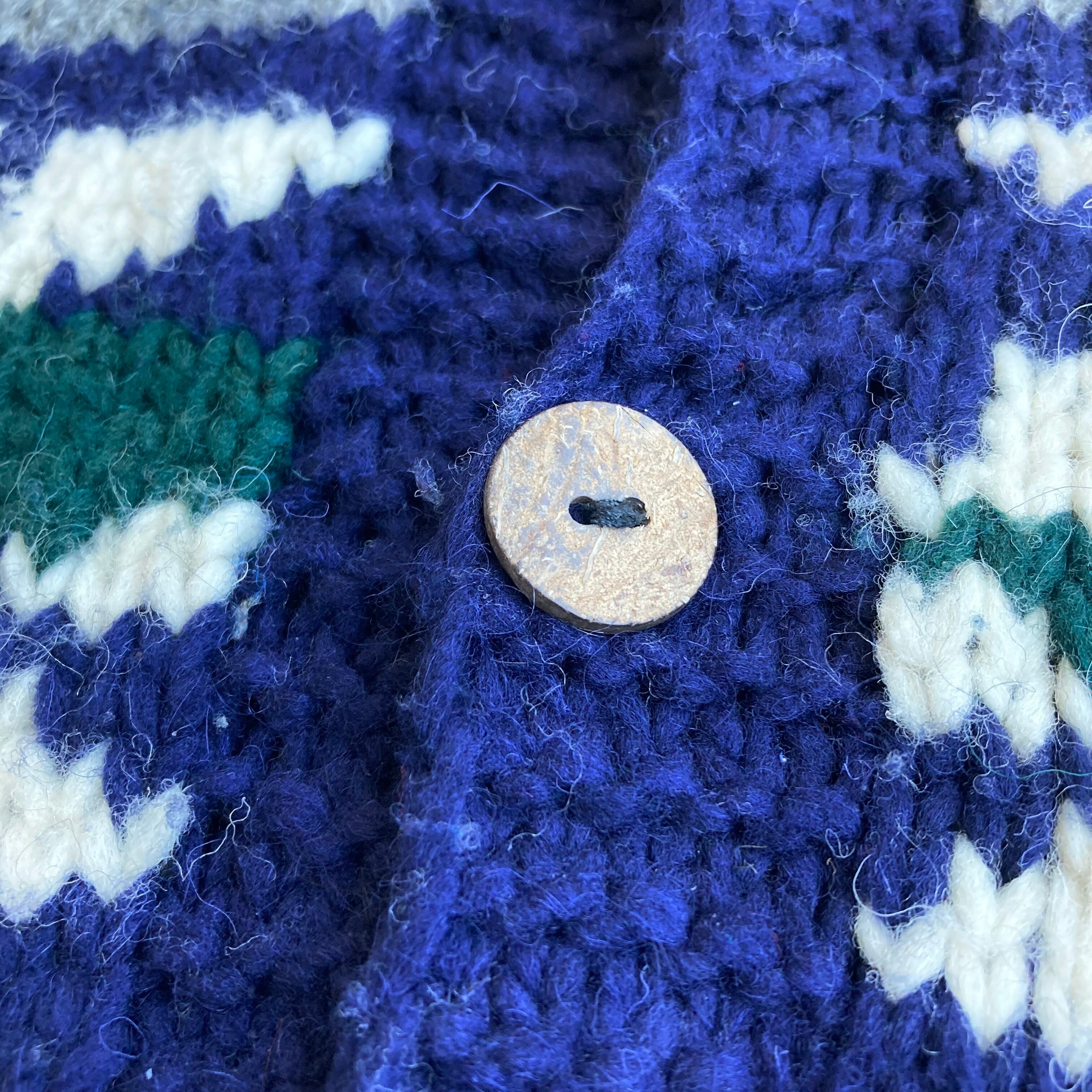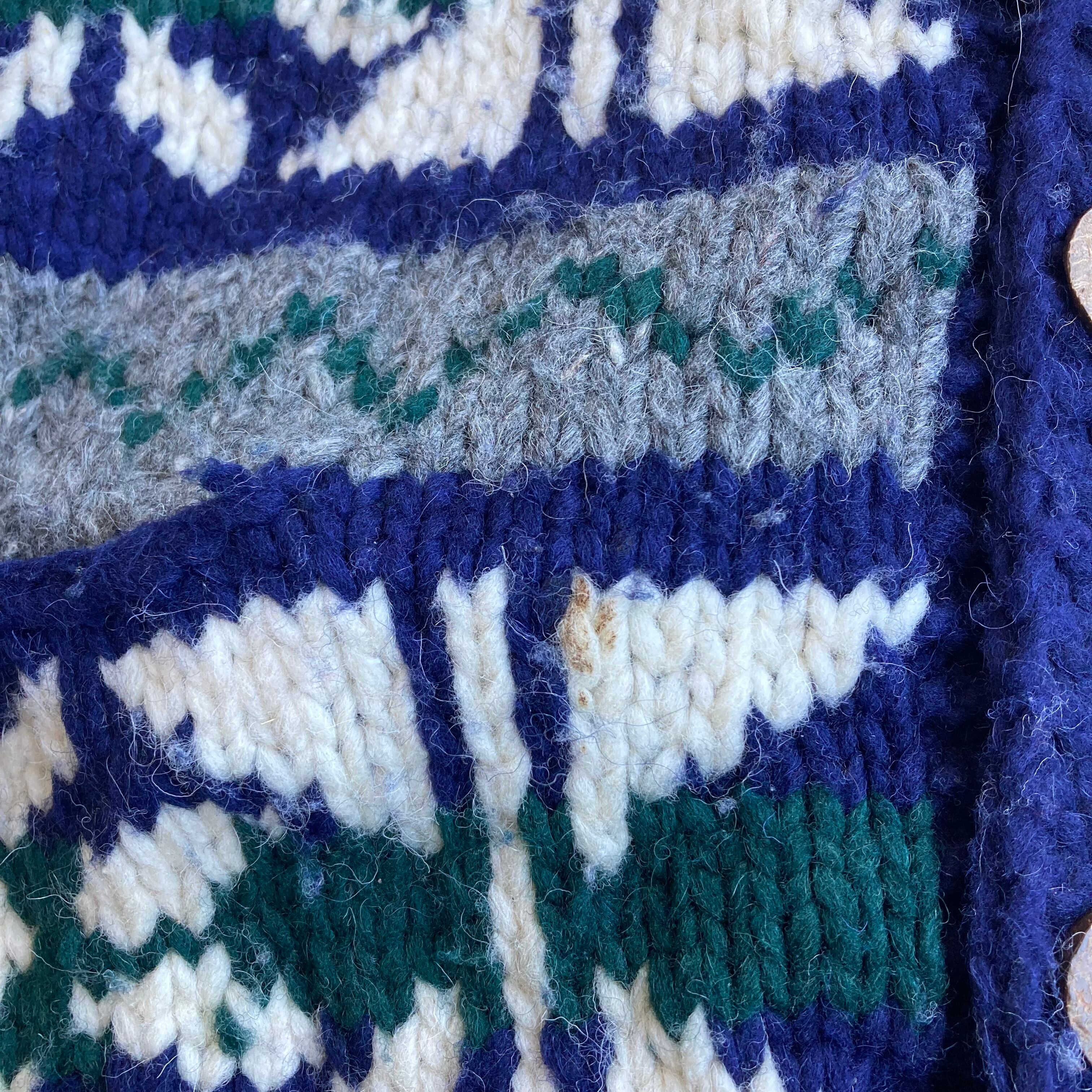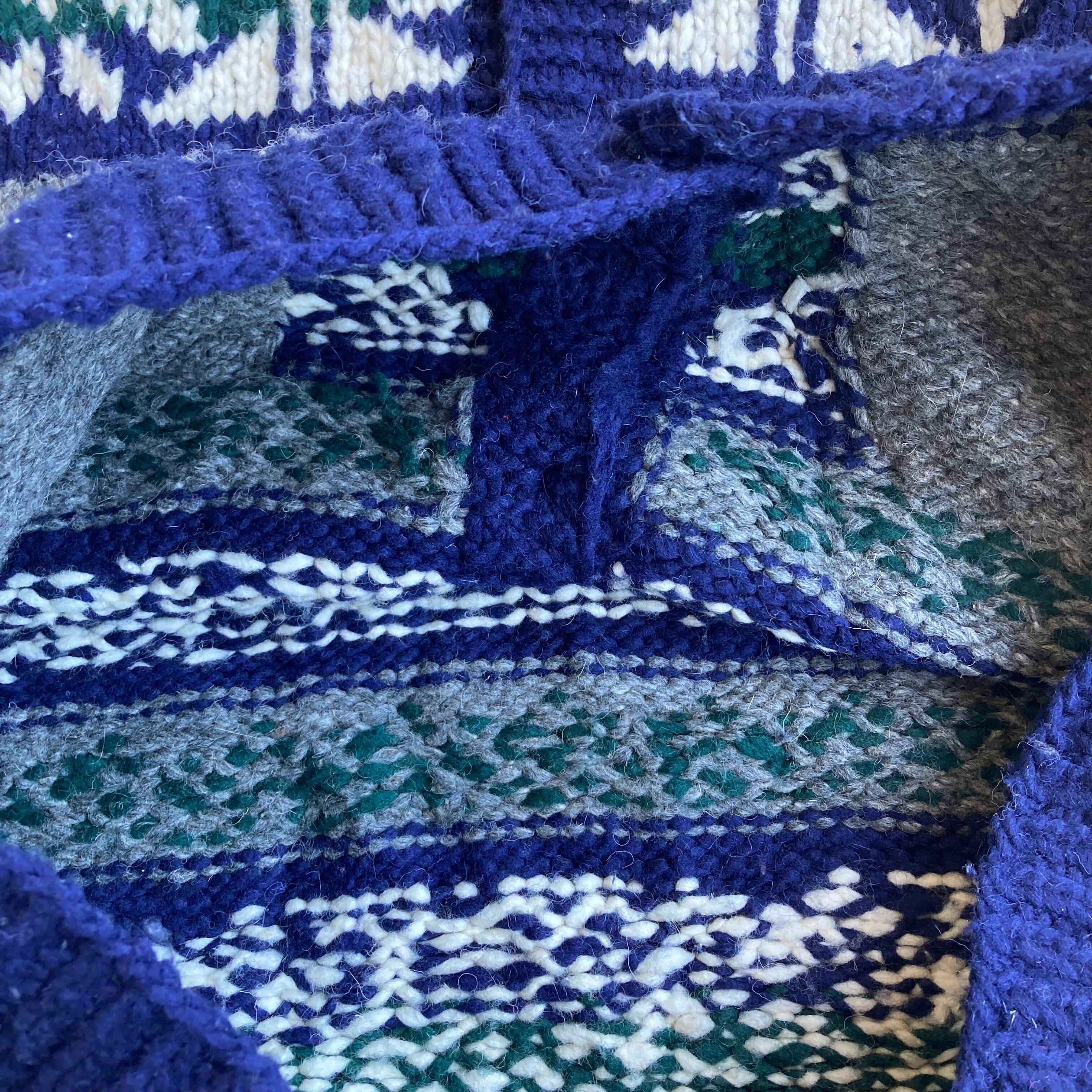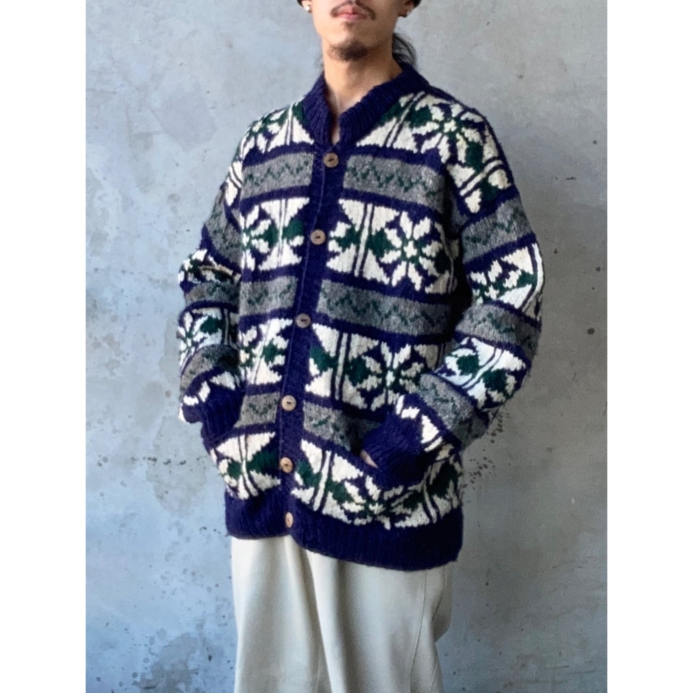 エクアドル製のノルディックセーターになります。肉厚のウール生地にハイネックデザインやウッドボタン、全体にかけてのノルディック柄が特徴的な1着です。ネイビー・グリーンの爽やかなカラーリングで、 デニム や スラックス 、 軍パン など様々なボトムスと相性良いと思われ、どちらかというとニットアウター感覚で着て頂けそうです。