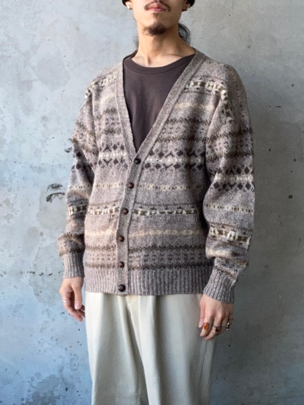 スコットランド製のフェアアイル柄カーディガンになります。ベージュのフェアアイルにくるみボタンデザインが、ほっこりと温かな雰囲気を感じる1着です。ボトムスのトーンを合わせて着て頂くと、雰囲気良いかと思います。