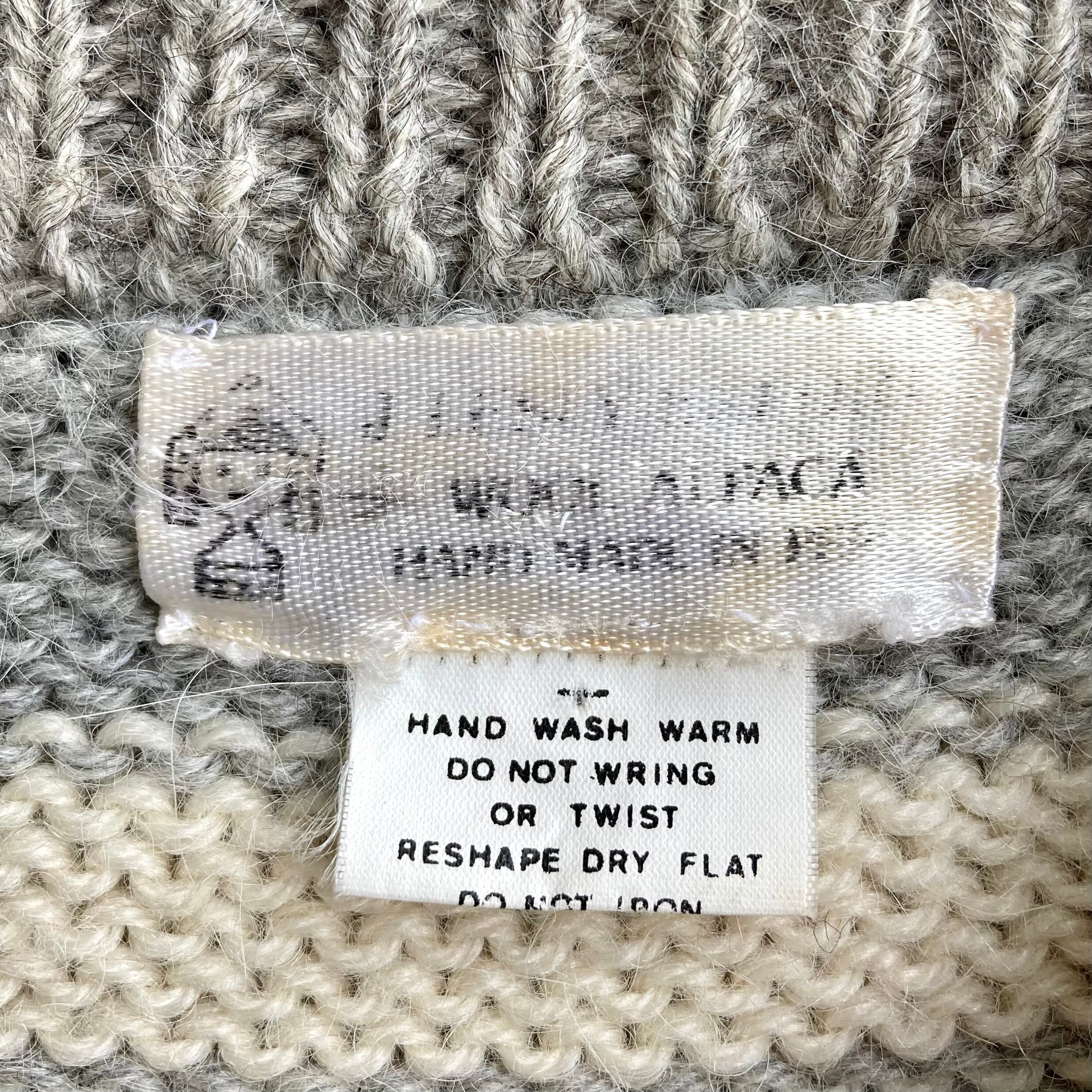 温かみのあるアルパカウールが使用されたデザインセーターになります。 モヘア のように毛足の長めな、しっとりと滑らかな生地感が特徴の1着です。ふんわりと包み込んでくれるような着心地で、ウールやカシミヤよりも保温性が高いと言われております。デザインも個性的で温もりを感じるものかと思います。