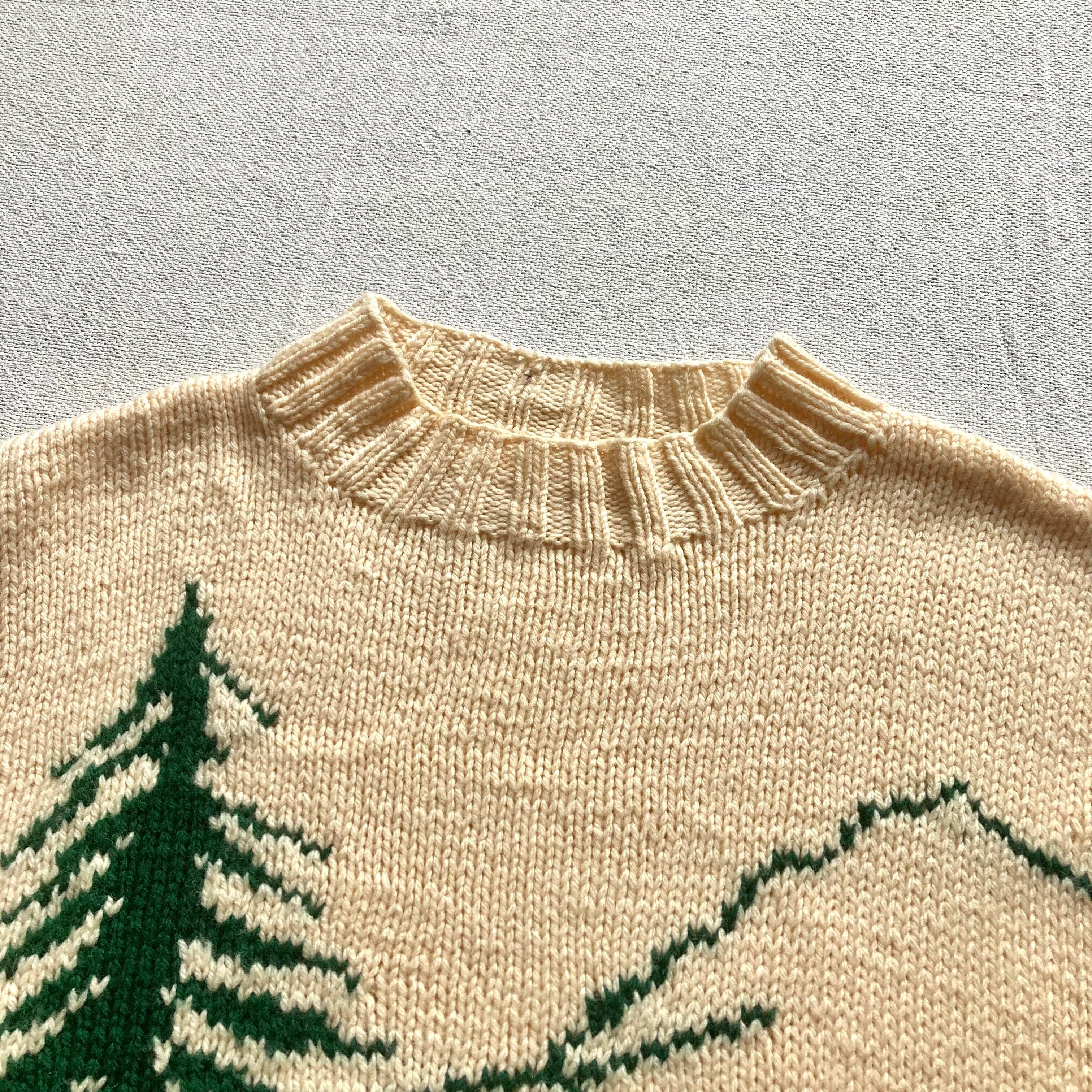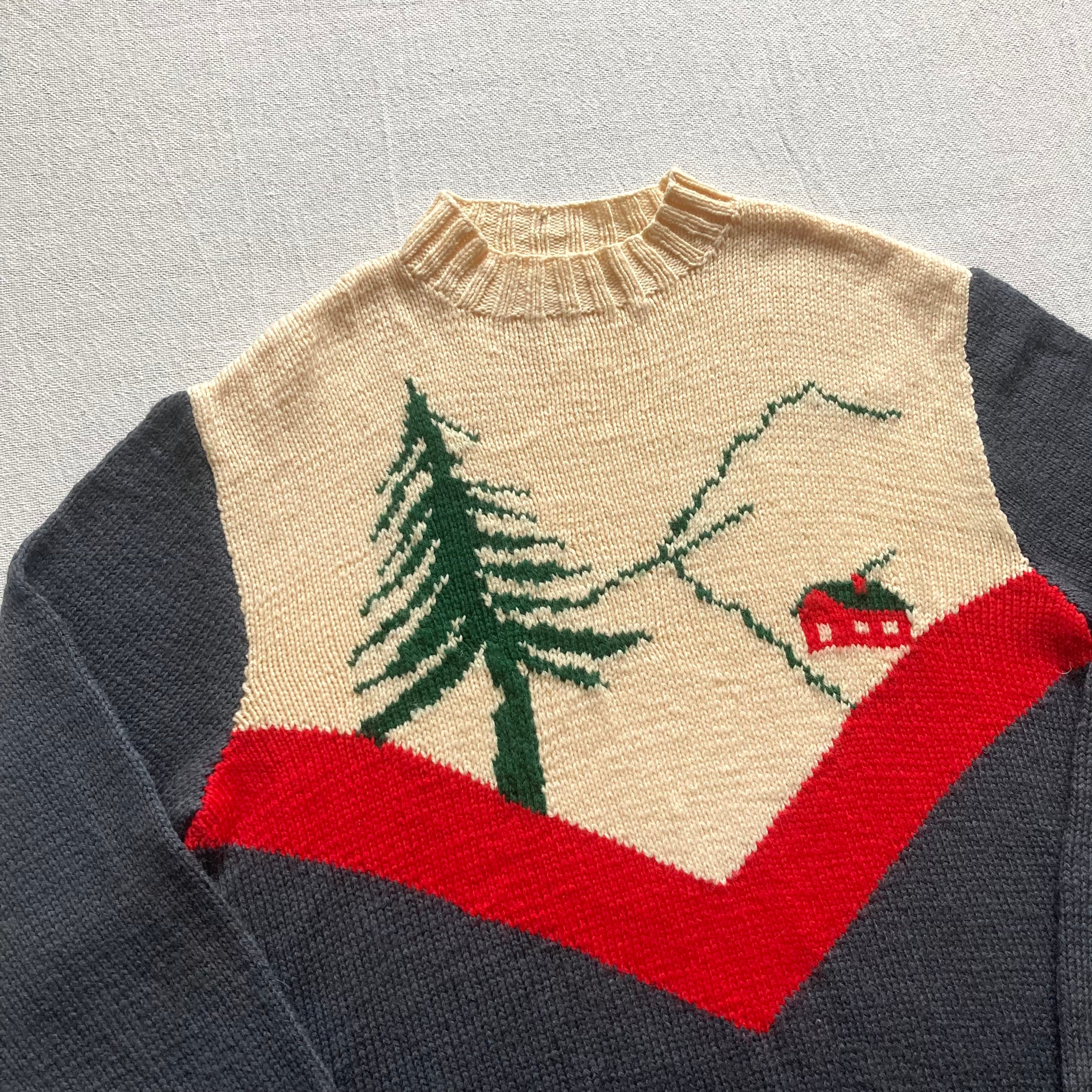 雪山や山小屋など、冬景色のイラストが編み込まれたモックネックセーターになります。ハンドニット物ですのでタグなどは御座いませんが、L程度のゆったりしたシルエットとなっております。レッドカラーのポイントカラーも良いアクセントかと思います。