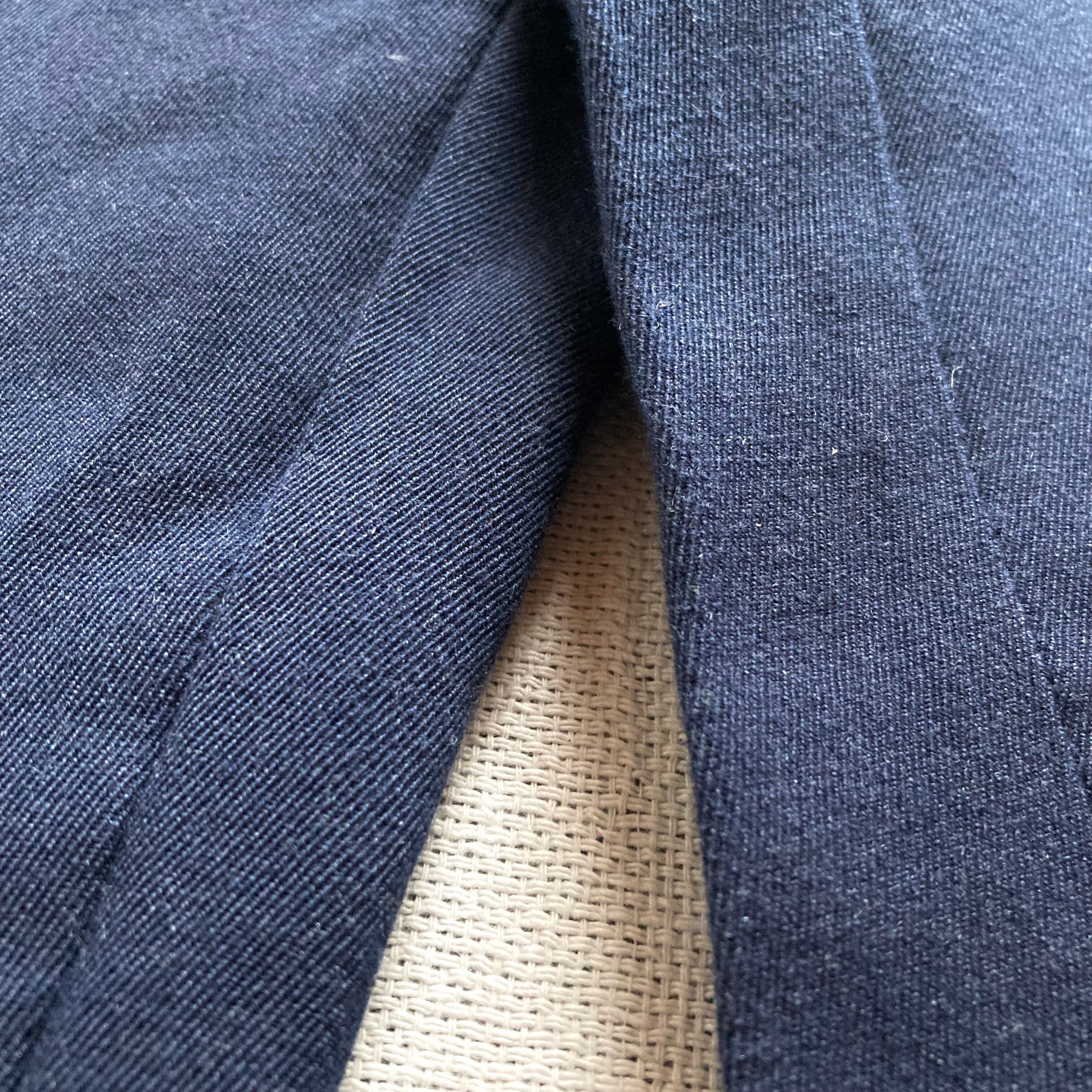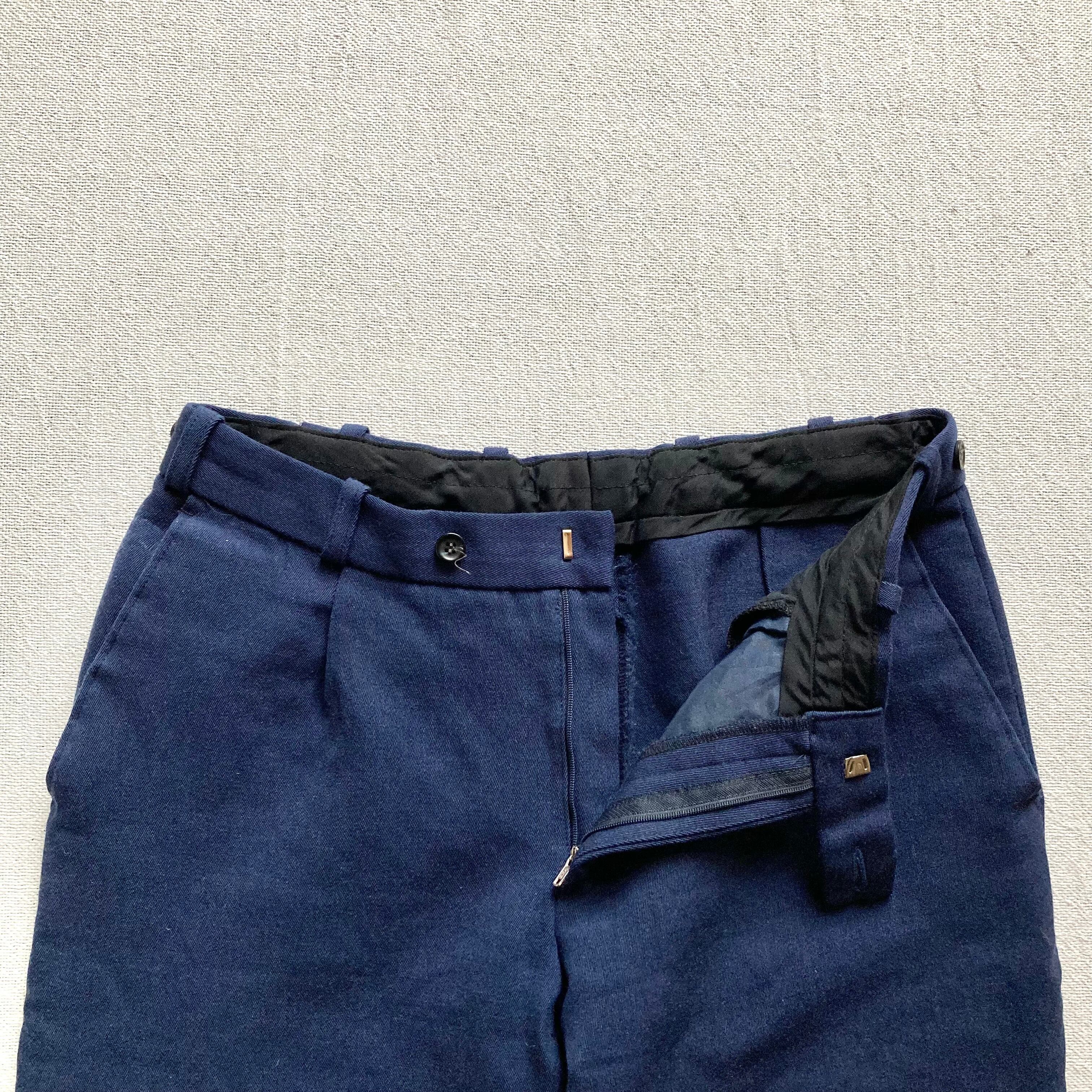落ち着いたネイビーのカラーリングに、程よくゆとりのあるすっきりとした丈感が特徴の一本です。厚すぎないウール地で、どちらかというとコットン生地に近いかと思います。穿いてみると分かりますが、やや丸みのあるコロンとした雰囲気が可愛らしいです。