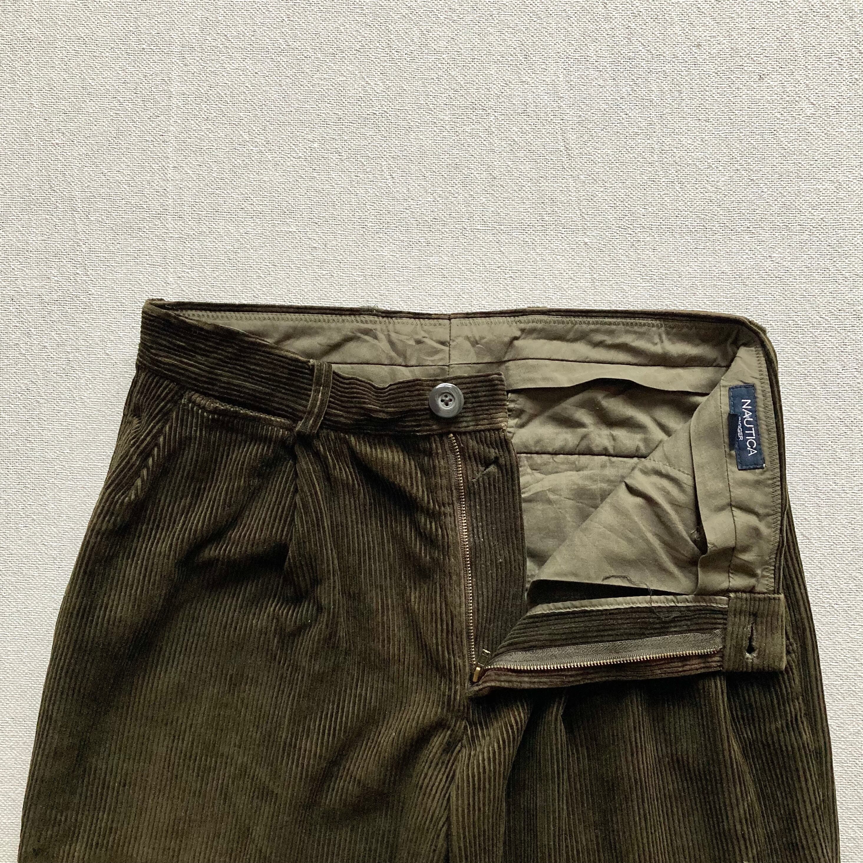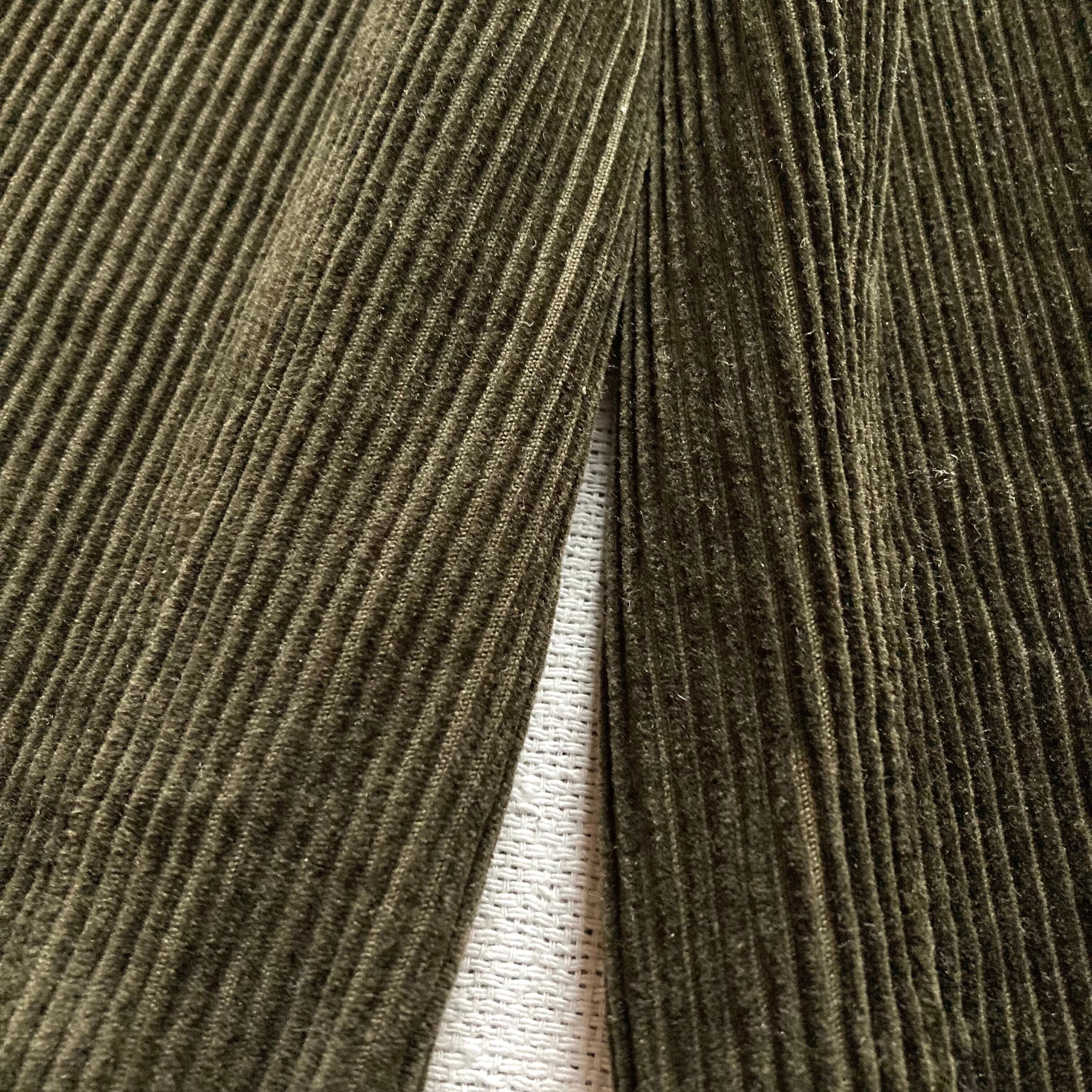 ブラウンに近いオリーブカラーに、全体にかけての緩く太いシルエットが特徴的な一本です。レーヨン20%入っておりますので、柔らかくストレスフリーな穿き心地となっております。