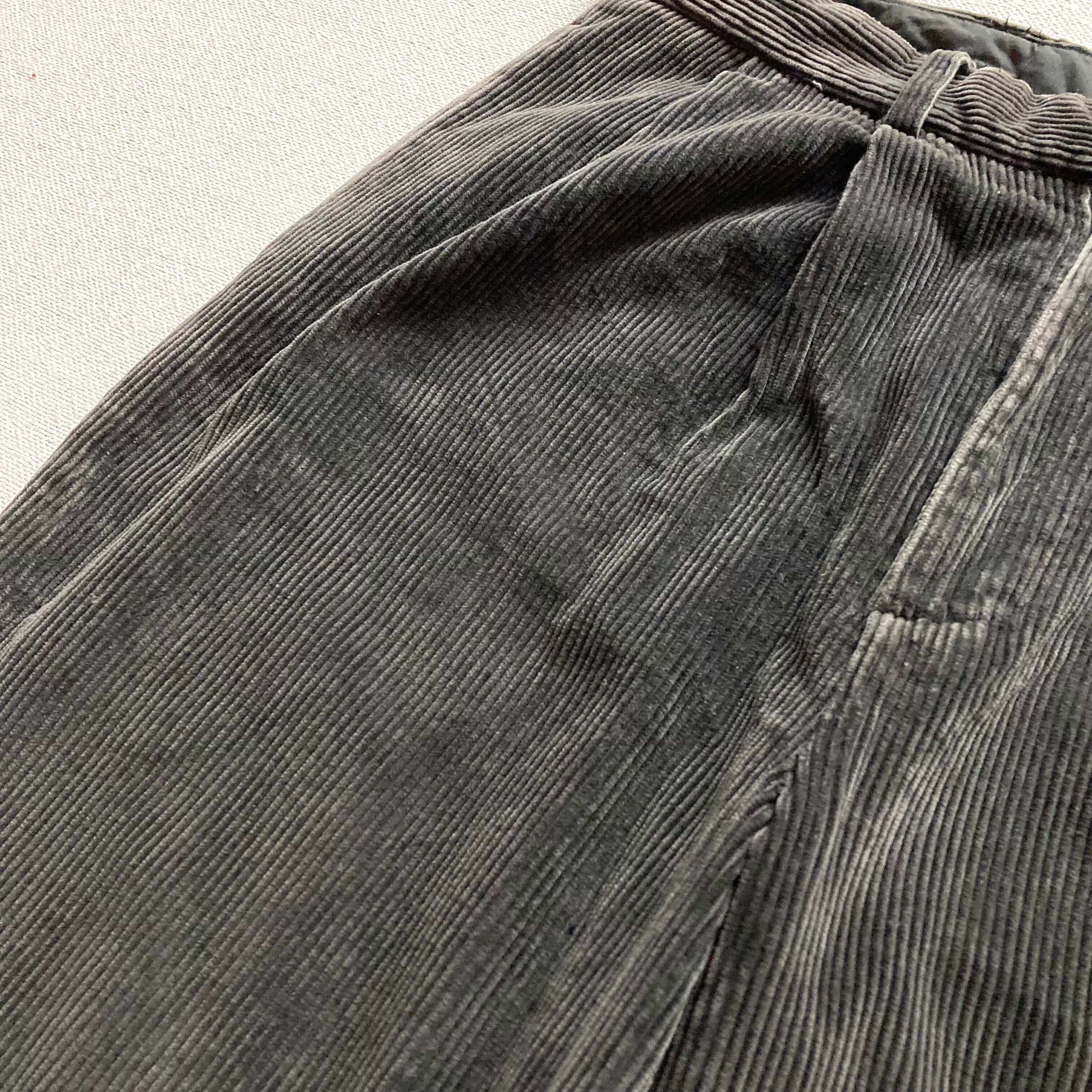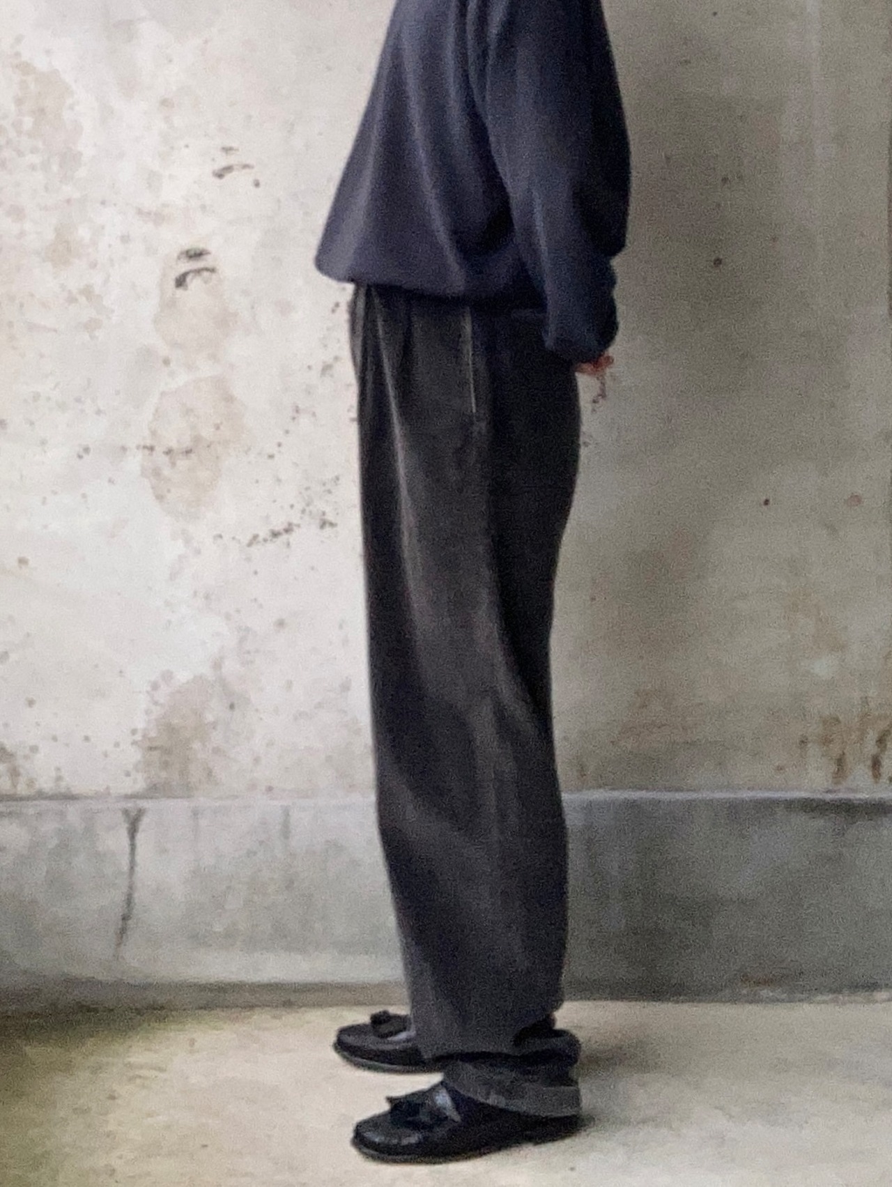 雰囲気のあるチャコールグレーカラーに、全体にかけての緩く太いシルエットが特徴的な一本です。柔らかくストレスフリーな穿き心地となっており、お気に入りのニットなどに合わせて頂ければと思います。