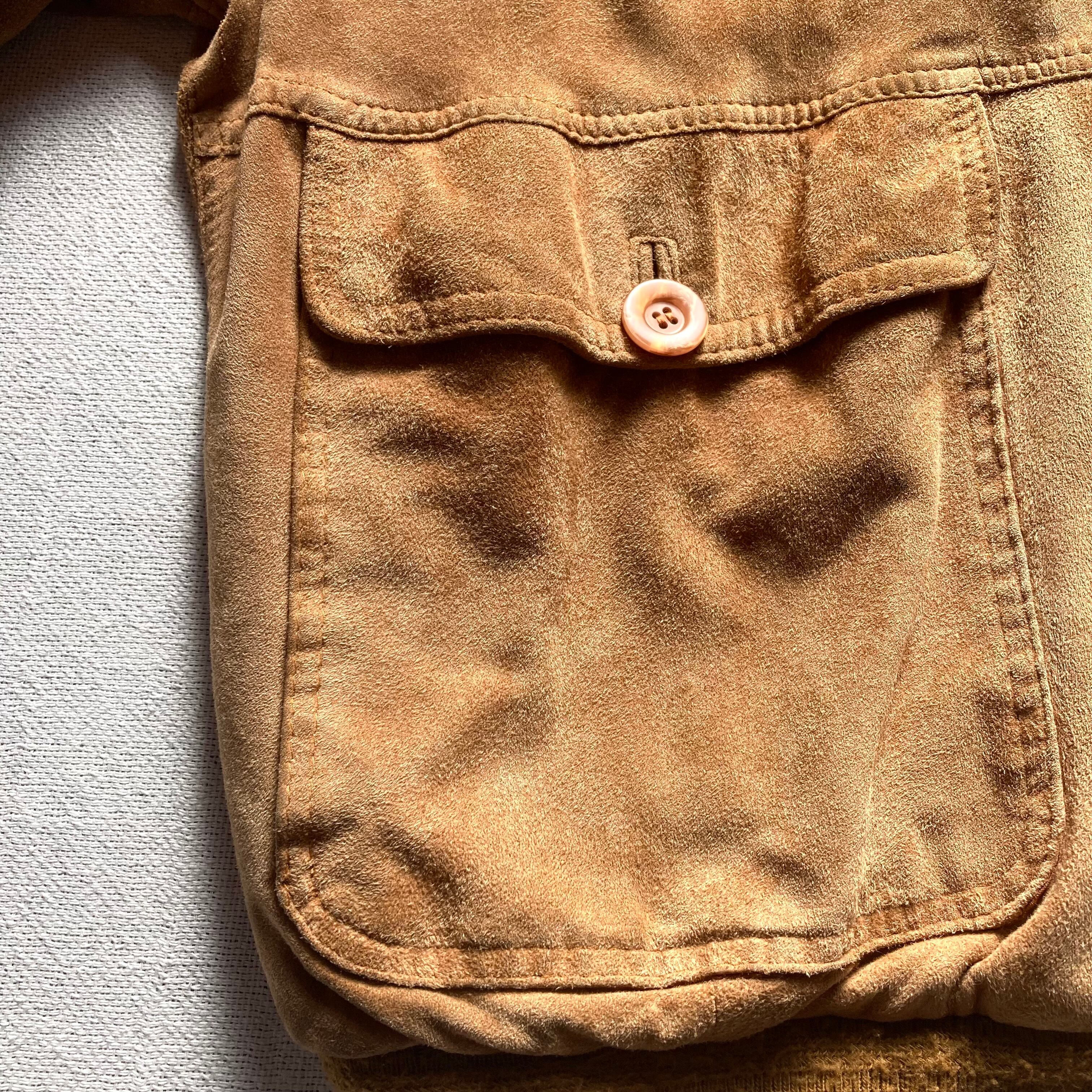 イタリア製のスエードレザーブルゾンになります。明るい雰囲気のブラウンボディに、非常に柔らかで滑らかなスエードレザーが使用された1着となっております。加えて、アームホールや肩まわりなども全体的にゆったりとしておりますので、まるでシルクブルゾンを羽織っているかのような着心地です。レザーでここまでの柔らかさを感じることが出来るのかと、驚くような1着になるかと思います。
